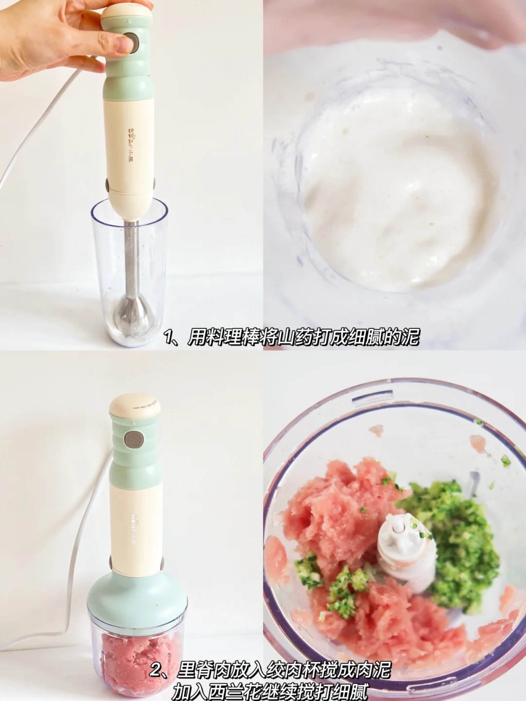 今天使用的的料理棒是小熊品牌方赠与的,看我做辅食就知道用了挺长时间的了,一共有5个档位,操作起来感觉更简便,打肉馅、蔬菜泥都挺细腻的,它还配有专门的研磨杯,适合磨一些香菇粉猪肝粉磨出来很细。