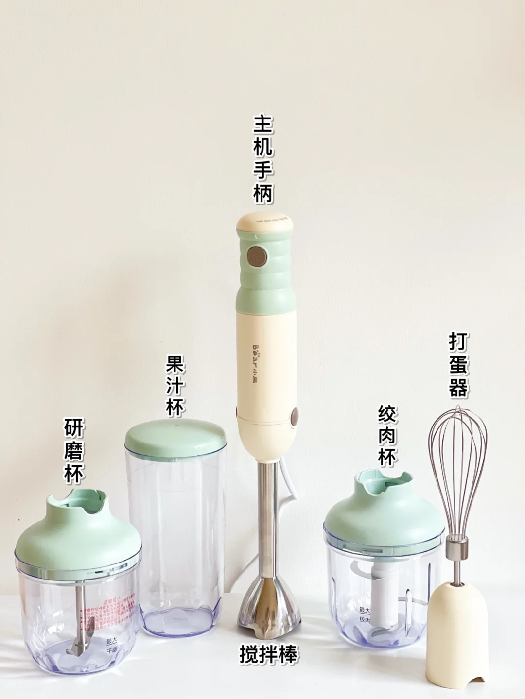 小熊料理棒配有打蛋器,果汁杯,研磨杯,绞肉杯,四种功能做起辅食来方便不少呢~