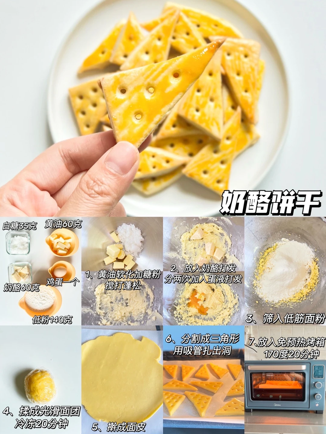 制作:黄油软化加糖粉搅打蓬松,放入奶酪继续搅打均匀,蛋液分两次搅打,筛入面粉,保鲜膜冷冻20分钟,取出擀成面皮,分割成三角形,用吸管扎出洞,放入烤箱170度20分钟