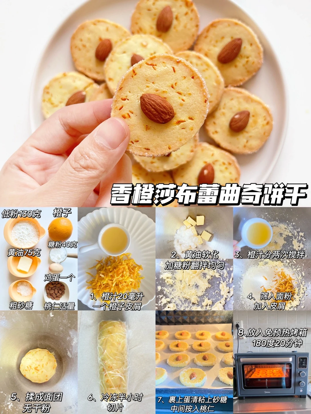 制作:橙子擦出皮屑,挤出20毫升橙汁,黄油软化加入糖粉,翻拌均匀,橙子分两次加入搅拌均匀,筛入面粉和皮屑揉成面团,保鲜膜冷冻半小时切片,裹上蛋清也可以不用,可以直接沾上白砂糖,中间按入桃仁,180度20分钟