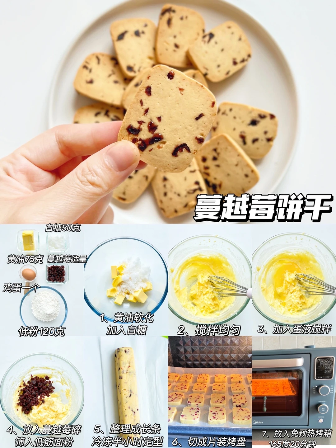 制作:黄油软化加入白糖翻拌均匀,蛋液分两次加入翻拌均匀,放入蔓越莓碎➕筛入面粉搅拌,揉成面团,整理成长条冷冻半小时,切成片,165度20分钟