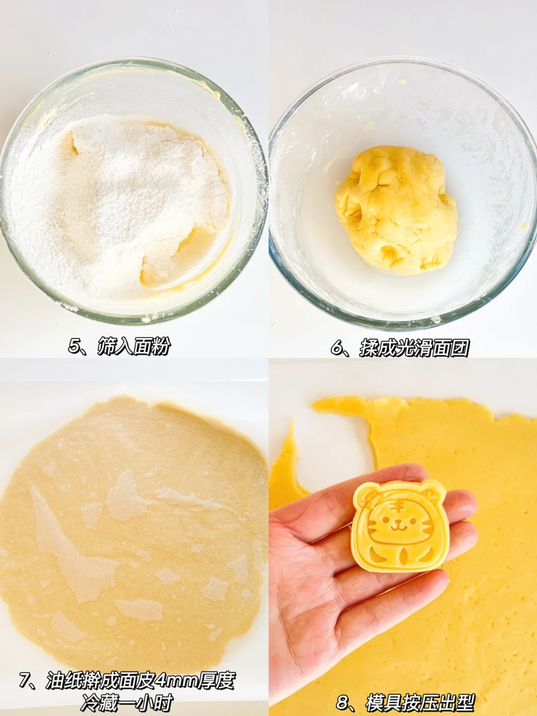4、用油纸盖住,擀成4mm厚度,放冰箱冷藏一小时,再用模具压出造型,放入烤盘,烤箱上下管预热,140度25分钟即可,烤箱脾气不同,最后十分钟大家观察一下调节哈!