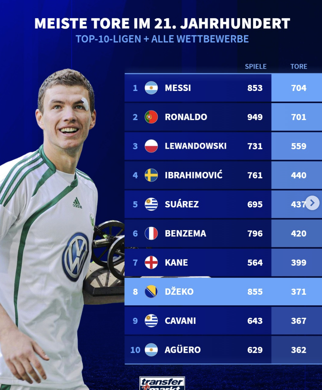 虎扑01月22日讯德转统计了本世纪前十大联赛以及各项赛事球员射手榜。