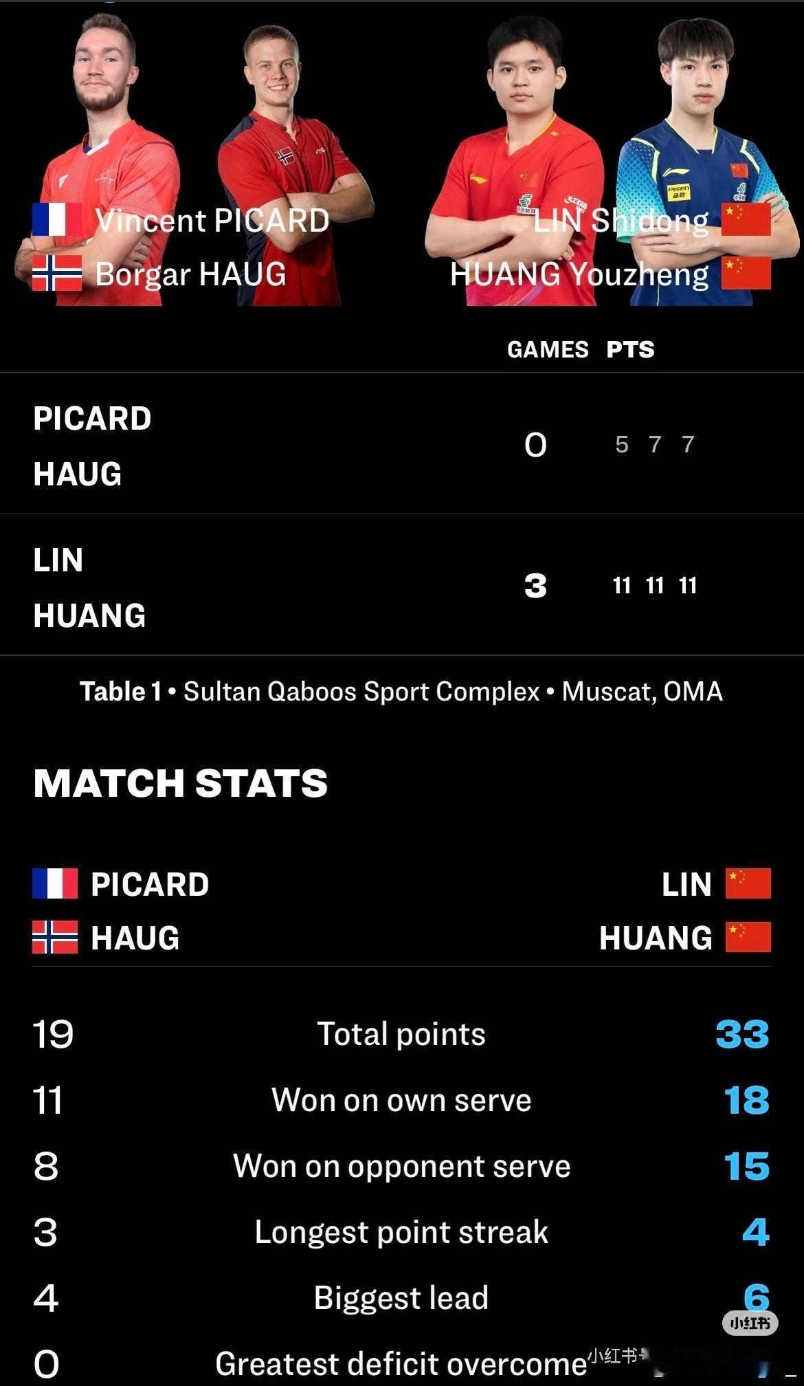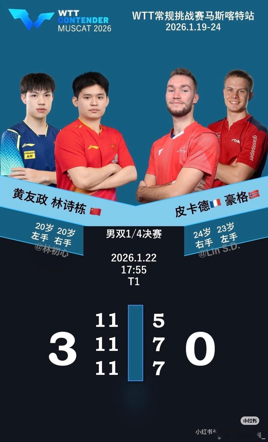林诗栋黄友政3比0皮卡德豪格马斯喀特常挑男双1/4决赛林诗栋黄友政🇨🇳3-0 皮卡德🇫🇷/豪格🇳🇴半决赛对阵:林诗栋黄友政🇨🇳 🆚 塔卡/玛纳什·沙🇮🇳这是一场最让人兴奋的比赛!
