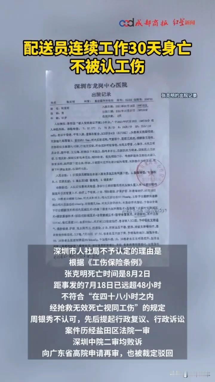 《工伤保险条例》48小时条款,质问到底是合法重要?还是合理重要? 19年46岁的张克明通过劳务外包成为超市配送员,无底薪按件计酬。21年7月18日,他扛28公斤货物爬8楼送货后,返程途中突发脑出血倒地,送医抢救9天后死亡。抢救超48小时未被认定工伤。 其妻子奔走维权5年无果,1月22日张克明的妻子周银秀向红星新闻表示不认可判决,她先后提起行政复议、行政诉讼。案件历经盐田区法院一审、深圳中院二审,她都败诉了,向广东省高院申请再审,也被裁定驳回。 《工伤保险条例》第十五条规定“在工作时间和工作岗位,突发疾病死亡或在48小时内经抢救无效死亡”视同工伤。换而言之抢救超过48小时则不认定为工伤。本来该条款是为了旨在排除与工作无关的慢性病。然而面对此条款的时候,家属却被迫面临“保命”或“保赔偿”的残酷抉择。放弃治疗可能获得工伤赔偿,坚持救治则面临经济保障丧失的风险。 48小时条款的困境是由于,医院的抢救时间超过了48小时,最终诊断为“病”而非“伤”。若是认定为“伤”家属可获百万元工亡补助金,这对需抚养子女及赡养老人的家庭至关重要。 而家属基于对生命的尊重和不舍坚持抢救,是符合社会伦理道德的行为。如果家属的抢救行为是出于善意,即使最终导致死亡时间超过48小时,也不应成为否定工伤认定的理由。 但现行的法律仅以“宣告死亡时间”为判定节点,太过于冰冷了吧!何不如把此法条换成,以“脑死亡”作为判定节点(张克明病历显示48小时内已无自主呼吸)。《工伤保险条例》的立法精神是优先保障劳动者权益,对法律条文存在争议时,应作出有利于劳动者的解释。 最后还有张克明去世后捐献器官救活6人,其生命价值获社会认可,可现实生活中的妻儿老小却被工伤体系拒之门外。法律天生就带有滞后性,必需通过司法解释细化“抢救无效”标准(明确持续抢救必要性),并将过劳猝死纳入职业病目录,避免劳动者成为制度缺陷的牺牲品。 工伤判定标准 工伤规定