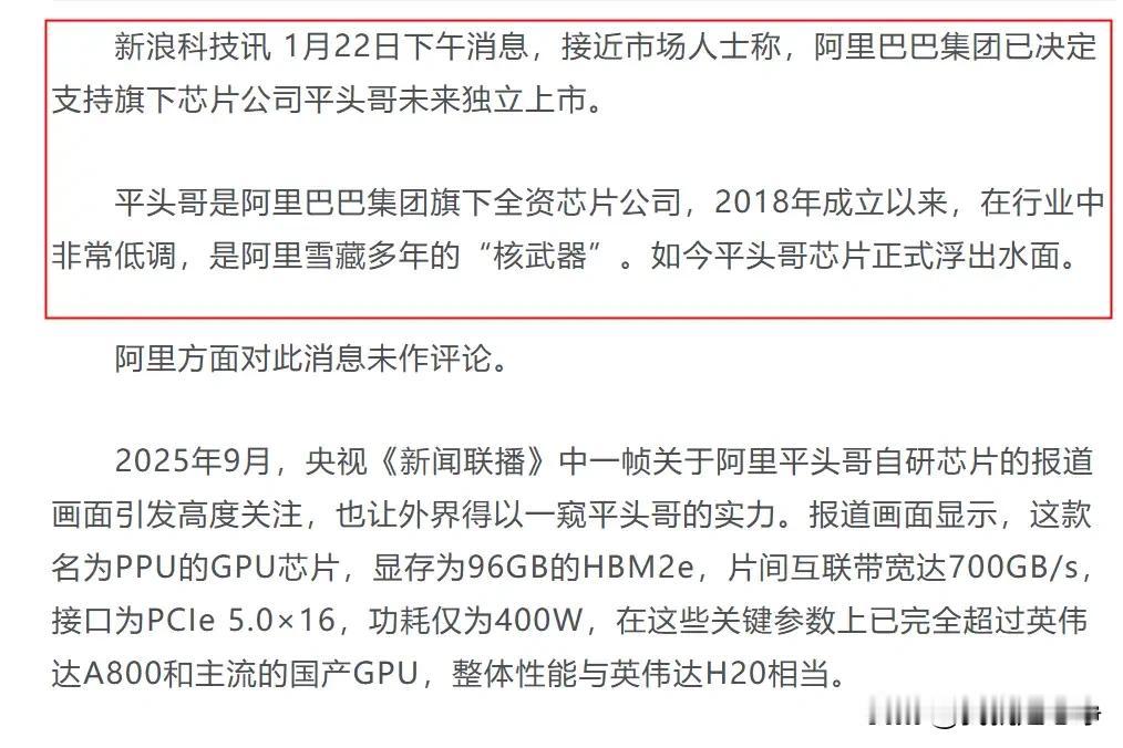 有点儿意思啊!阿里旗下如果真的把这种芯片搞出来了,性能如果真的如他所宣传的一样。 那么我还真的要对阿里集团道个歉,以前以为这个集团只知道卖货,放贷呢。 没想到也在悄然的布局高科技啊。 居然还搞成了。 按照他的宣传标准参数,它的部分性能已经超越了英伟达a800 跟h20基本相当,最关键的是新闻联播里面透露了这个消息。 这就保证了它的真实度。 看来咱们中国的科研人员已经彻底吃透了芯片的制造原理。 门槛已经不复存在了,后面我们要做的就是冲产量。 还需要一些时间,把产量冲起来。 但是对于中国人来说,冲产量这种事情,您根本就不用担心。