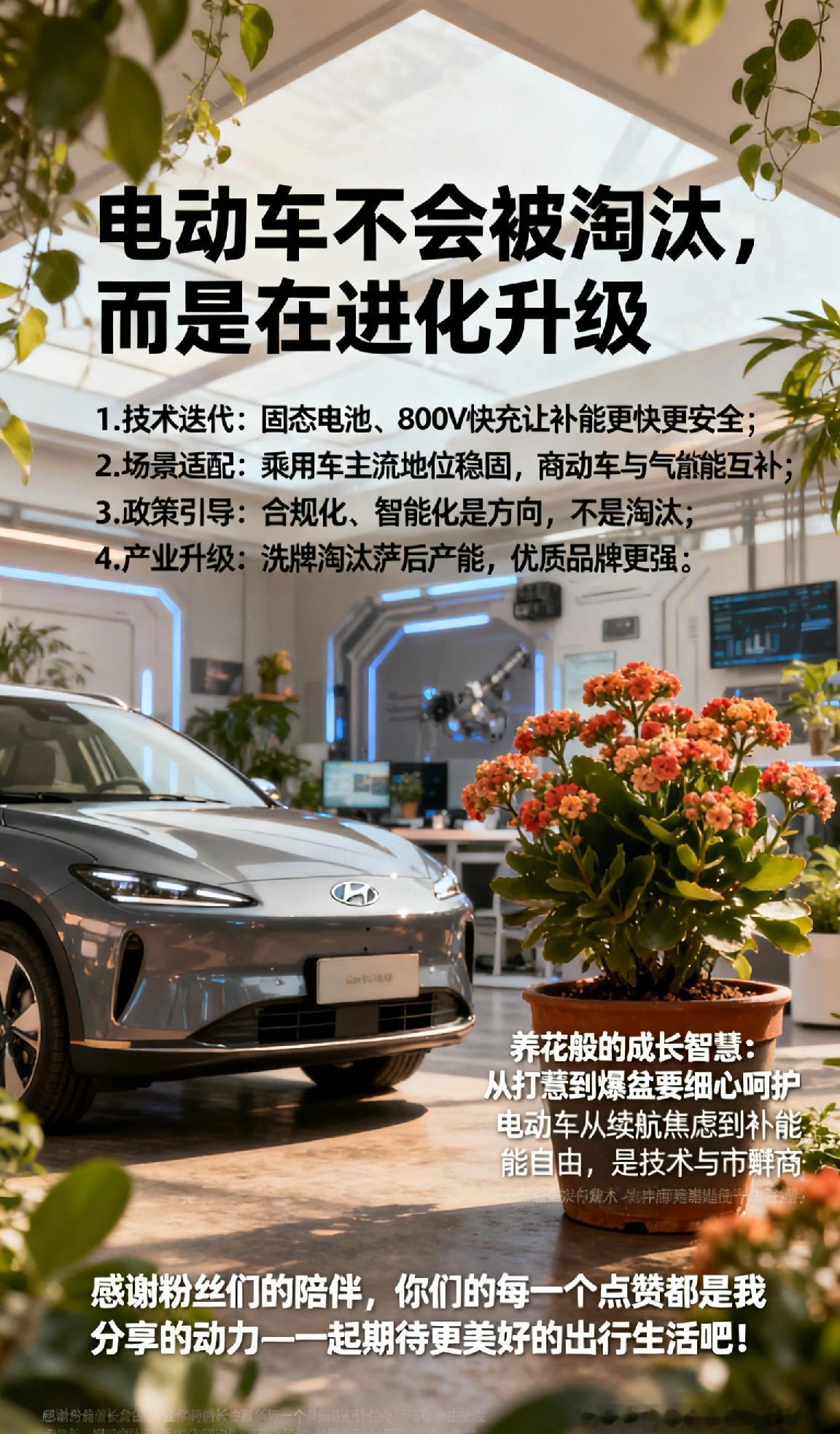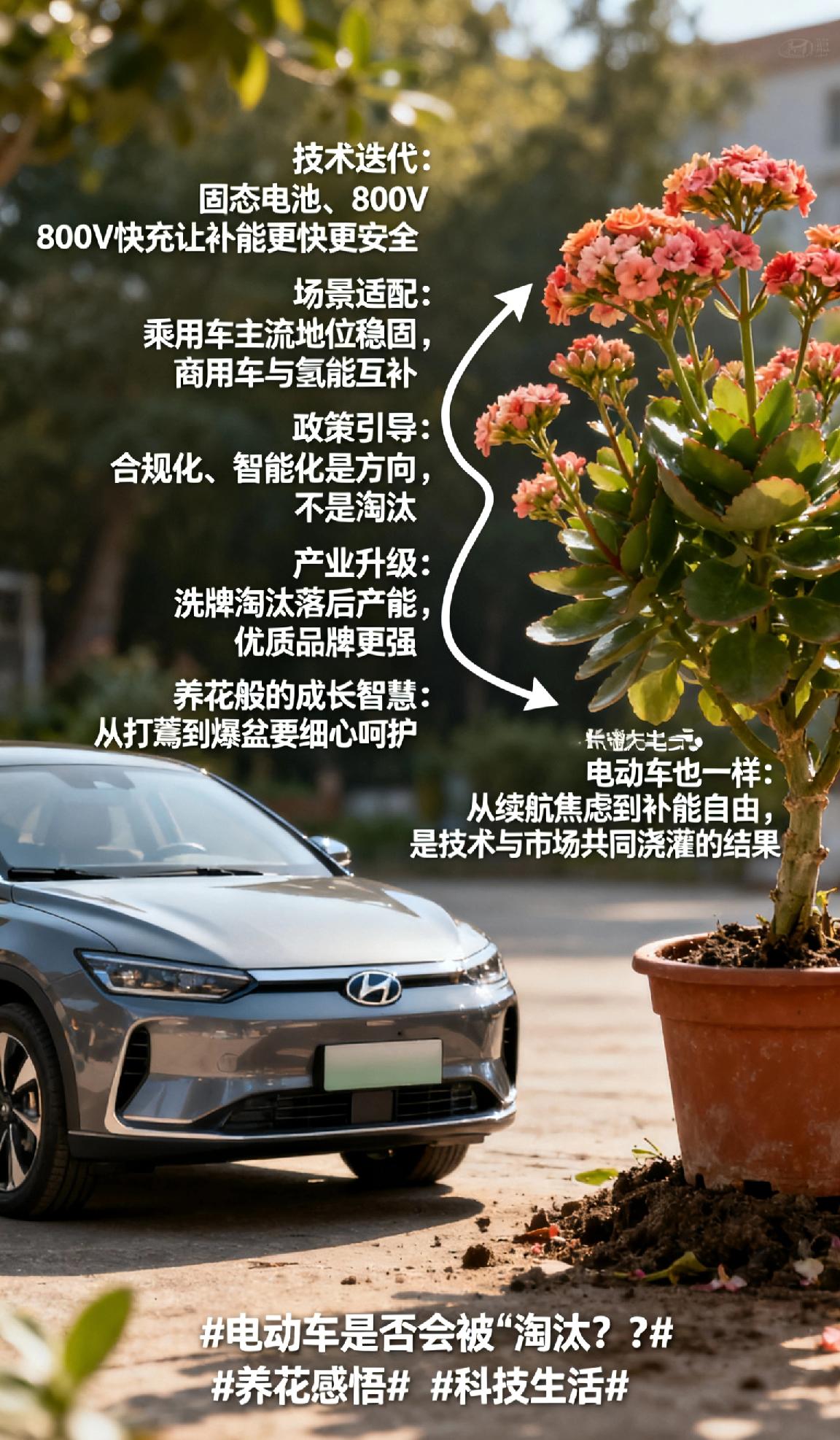 电动车是否会被“淘汰”? 电动车不会被淘汰,而是在进化升级——就像养花要耐心等花开,出行工具也在迭代变好。 为什么不会被淘汰 1. 技术迭代:固态电池、800V快充让补能更快更安全 ​ 2. 场景适配:乘用车主流地位稳固,商用车与氢能互补 ​ 3. 政策引导:合规化、智能化是方向,不是淘汰 ​ 4. 产业升级:洗牌淘汰落后产能,优质品牌更强 养花般的成长智慧 就像我养的长寿花,从打蔫到爆盆要细心呵护。电动车也一样,从续航焦虑到补能自由,是技术与市场共同浇灌的结果,淘汰的是旧模式,不是新未来。 感谢粉丝们的陪伴,你们的每一个点赞都是我分享的动力~一起期待更美好的出行生活吧! 电动车是否会被“淘汰”? 养花感悟