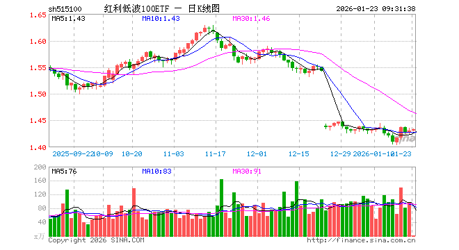 1月23日,红利低波100ETF(515100)开盘涨0.00%,报1.431元。红利低波100ETF(515100)重仓股方面,冀中能源开盘涨0.18%,大秦铁路涨0.00%,双汇发展涨0.16%,厦门国贸涨0.29%,江中药业跌0.04%,苏泊尔涨0.16%,雅戈尔涨0.27%,中国石化涨0.00%,格力电器涨0.30%,葵花药业涨0.34%。