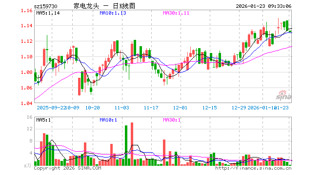 1月23日,龙头家电ETF(159730)开盘涨0.00%,报1.133元。龙头家电ETF(159730)重仓股方面,三花智控开盘跌1.73%,格力电器涨0.30%,美的集团涨0.10%,海尔智家涨0.31%,德业股份涨0.29%,科沃斯跌0.02%,石头科技涨0.35%,公牛集团跌0.05%,海信家电涨0.20%,老板电器涨0.20%。