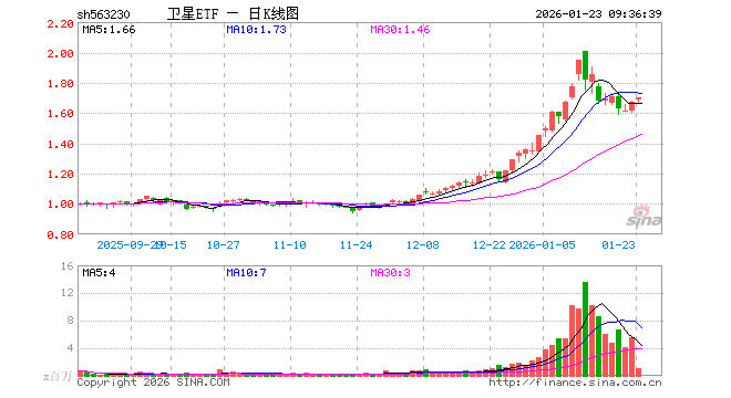 卫星ETF(563230)业绩比较基准为中证卫星产业指数收益率,管理人为富国基金管理有限公司,基金经理为曹璐迪、殷钦怡,成立(2025-09-04)以来回报为66.84%,近一个月回报为38.42%。