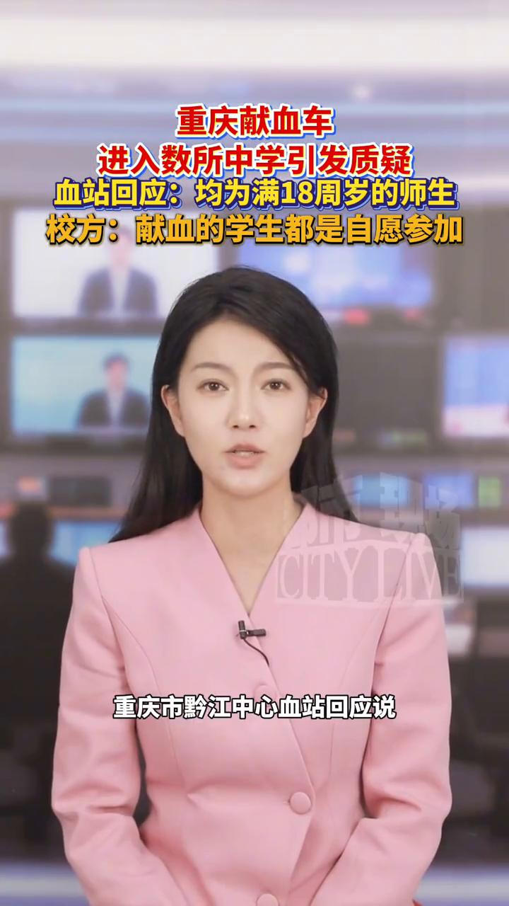 重庆献血车进入数所中学引发质疑。血站回应:均为满18周岁的师生。校方:献血的学生都是自愿参加。 都市现场主播郭恺。 重庆有献血车进中学引关注。据新京报报道,近日重庆彭水县数所中学有献血车进校举办师生无偿献血活动。有网友质疑国家提倡献血年龄为18周岁至55周岁,而中学学生多为未成年人。 重庆市黔江中心血站回应说此次活动为血站与学校合作举办,献血者均为满足身体指标的年满18周岁的学生和学校教师。彭水县民族中学工作人员表示献血的学生都是自愿参加,目前暂无学生反映因献血出现严重不适。