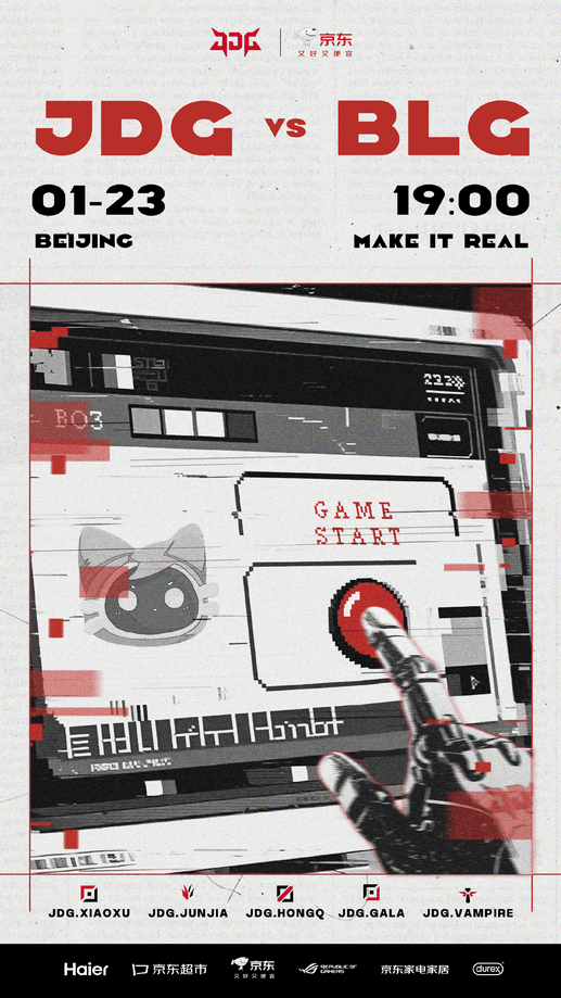 虎扑01月23日讯BLG对战JDG的比赛将于今日约19:00进行,赛前双方发布海报预热: