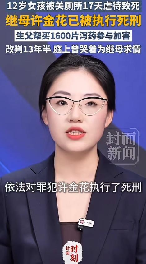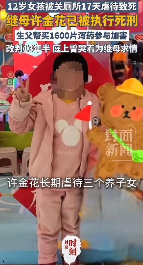 丧尽天良!12岁女孩琪琪,被继母关厕所17天虐待致死,继母被执行死刑!生父帮买1600片泻药参与加害,法院改判12年半!庭上曾哭着为继母求情!网友:“法庭上哭着为继母求情?你女儿在厕所里哭的时候,你在哪?!这种父亲,怎么能轻判?”   备受关注的12岁女孩琪琪被虐致死案终于有了最终落点——继母许金花被依法执行死刑。   这个双手沾满孩子鲜血的恶魔,终究为自己的暴行付出了最沉重的代价,但琪琪所受的痛苦、生父的冷漠助虐,至今仍让人心头发紧。   事情发生在2023年12月的福建莆田,12岁的琪琪被继母许金花从6号开始关在卫生间,一锁就是17天。   这17天里,她被手脚捆绑,遭受殴打、冻饿、开水烫,甚至被指使其他孩子重击头部,而作为亲生父亲的刘江,不仅视而不见,还帮着网购了1600片泻药,供许金花强迫琪琪服用。   更令人发指的是,许金花多次把琪琪受虐的照片发给刘江,他非但不救,还表示支持默许,全程没回家看过孩子一眼。   12月22日,琪琪最终没能熬过去,因外伤感染、饥饿寒冷等多种因素,急性循环功能衰竭死亡。   那时她才12岁,体重却只有40多斤,身上遍布创伤,脚趾被针扎穿,嘴巴被缝,全身器官多处受损,想想都让人窒息,案发后,许金花还试图清洗现场、删除监控,掩盖罪行。   一审时,许金花被判处死刑,刘江因故意伤害罪、虐待罪被判五年六个月,这个结果让琪琪生母崩溃,她认为生父的刑罚太轻,而刘江还在庭上辩解泻药是减肥药,甚至为许金花求情,说对她的判决过重。   说白了,这个父亲早已丧失了为人父的底线,女儿在厕所里绝望哭喊时,他在为加害者求情,何其讽刺。   正因一审对刘江量刑畸轻,法院启动再审程序,去年12月将他的刑期改判为十三年六个月,剥夺政治权利二年。   法院认定,许金花是主犯,直接导致琪琪死亡,而刘江作为监护人,参与加害、纵容许金花施暴,虽系从犯,但情节恶劣,必须严惩,今年1月20日,许金花被执行死刑,算是给了琪琪一个迟来的告慰。   网友的愤怒不是没有道理,法庭上刘江哭着为继母求情,可他女儿在暗无天日的厕所里承受折磨时,他在哪?   作为生父,本应是孩子最后的依靠,他却成了施暴者的帮凶,这种背叛比殴打更伤人。   即便改判十三年半,在很多人看来,依旧抵不过琪琪12年的生命和17天的炼狱。   案件落幕,但留给我们的思考没停,孩子的成长需要监护人的守护,而非伤害,法律能严惩恶行,却换不回逝去的生命。   只愿琪琪在另一个世界安好,也希望这样的悲剧再也不要发生,每个孩子都能被温柔以待。