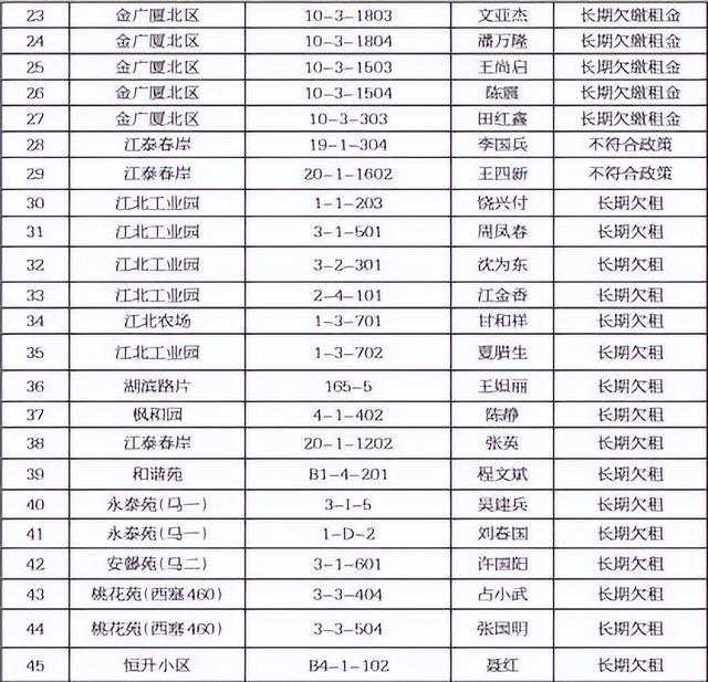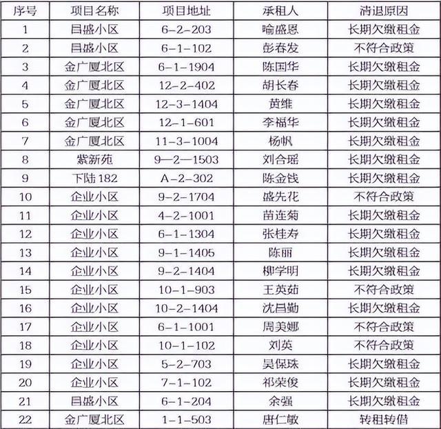 为切实加强公租房、人才公寓运营管理工作,避免国有资产流失,经公司调查核实,喻盛恩等45户公租房、人才公寓住户存在转租转借、欠缴租金连续6个月以上、不符合政策条件、无故闲置6个月以上等违规行为。请喻盛恩等45户公租房、人才公寓住户自本公告发出之日起7个工作日内,前往各站点办理退房手续并腾空房屋。若限期内未办理退房手续,我公司将依法进行清退,并保留进一步追究相关违约责任的权利;同时,清退时房屋内有物品的,我公司将保管6个月,逾期若无人认领,视为主动放弃,我公司将自行处置。