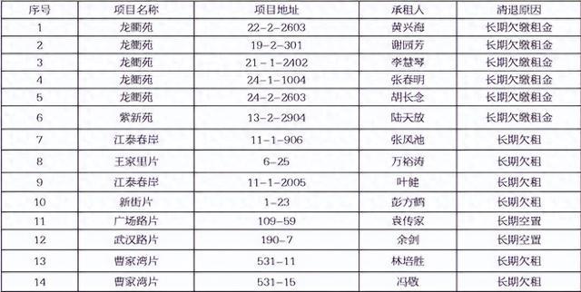 为切实加强国有公房、保租房运营管理工作,避免国有资产流失,经公司调查核实,黄兴海等14户国有公房、保租房住户存在转租转借、欠缴租金连续6个月以上、无故闲置6个月以上等违规行为。请黄兴海等14户国有公房、保租房住户自本公告发出之日起7个工作日内,前往各站点办理退房手续并腾空房屋。若限期内未办理退房手续,我公司将依法进行清退,并保留进一步追究相关违约责任的权利;同时,清退时房屋内有物品的,我公司将保管6个月,逾期若无人认领,视为主动放弃,我公司将自行处置。