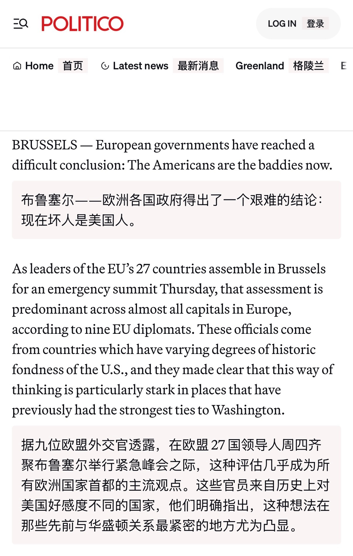 🔻politico:欧洲人说,“草啊美国人怎么这么坏啊”特朗普为啥时隔一天态度变了普京称格陵兰岛美国真要买也得买得起热点现场海外新鲜事