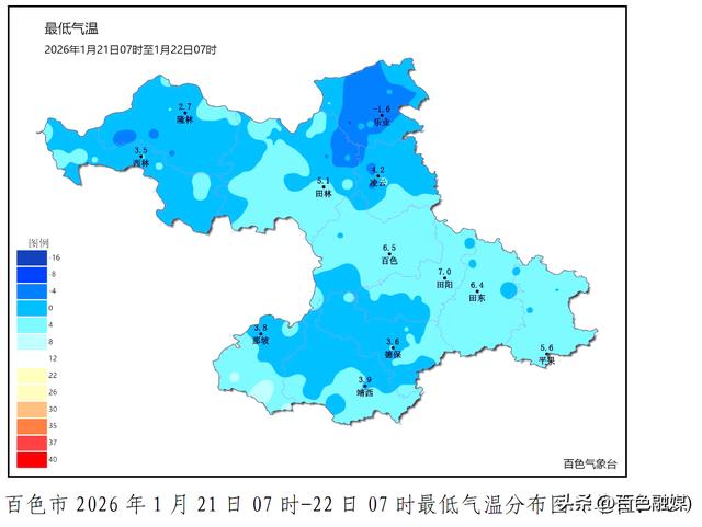全市大部地区24小时平均气温下降5~10℃,最低气温:高海拔山区-4.2~0.7℃,山区3~6℃,右江河谷6~7℃;0℃以下的站点共22站,主要分布在田林浪平、百乐,乐业花坪、同乐、逻沙,隆林金钟山、猪场、德峨、蛇场,凌云玉洪、泗城,其中最低气温出现在田林浪平桂西之巅-4.2℃。
