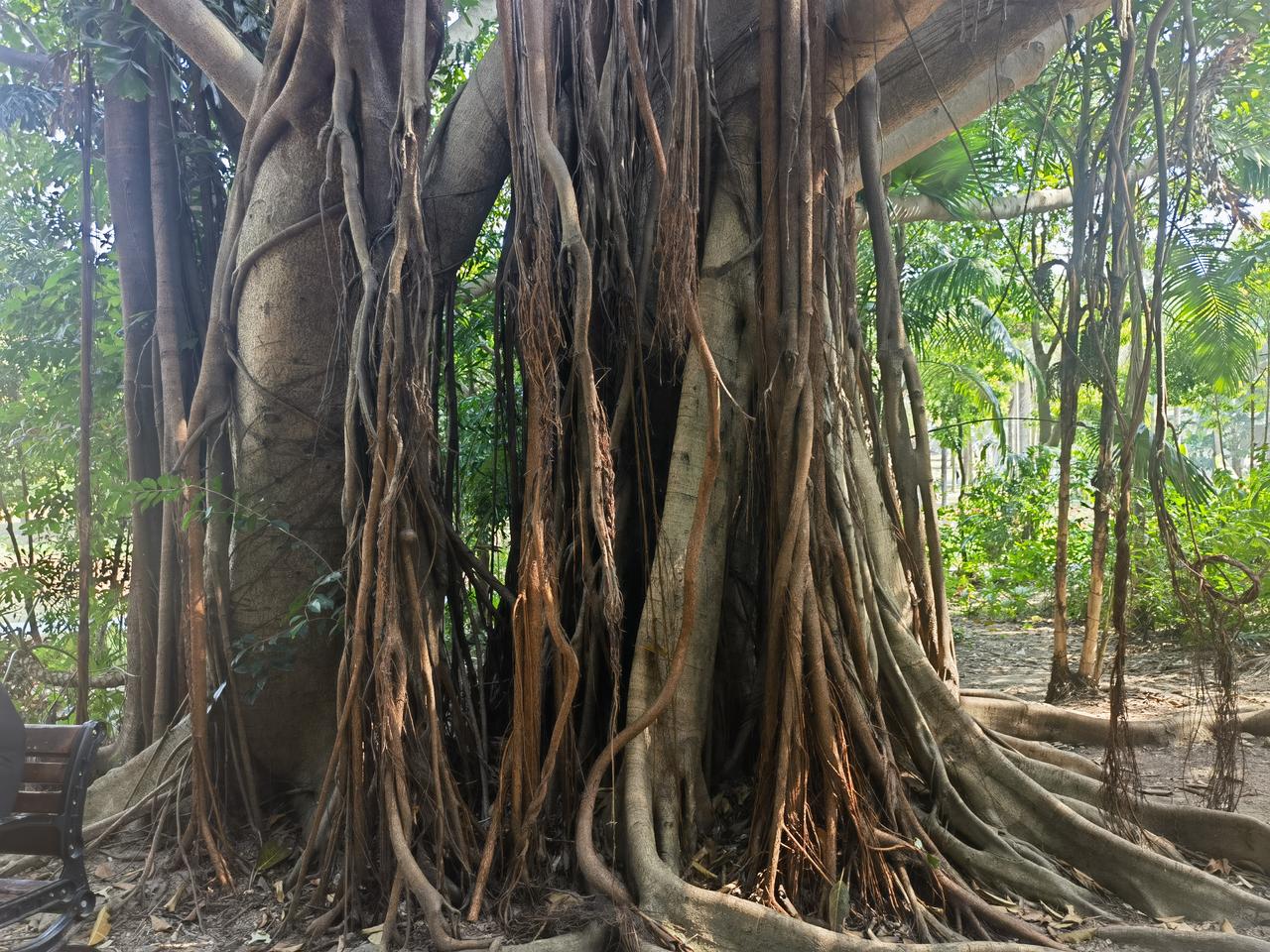 七律《榕树赋》 南国嘉榕立野川,树虬干伟映长天。 根须着地千丝绕,冠盖如云万木延