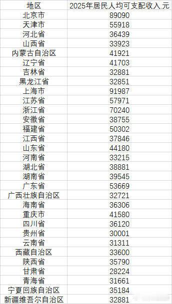 2025年31省份去年人均可支配收入2025全国居民人均可支配收入增长5%上海以91987元,位居第一;北京89090元,排第二;浙江70240元,第三名江苏、天津、广东、福建、山东、内蒙古、辽宁去年居民人均可支配收入分列四到十位。2025年中国经济成绩单