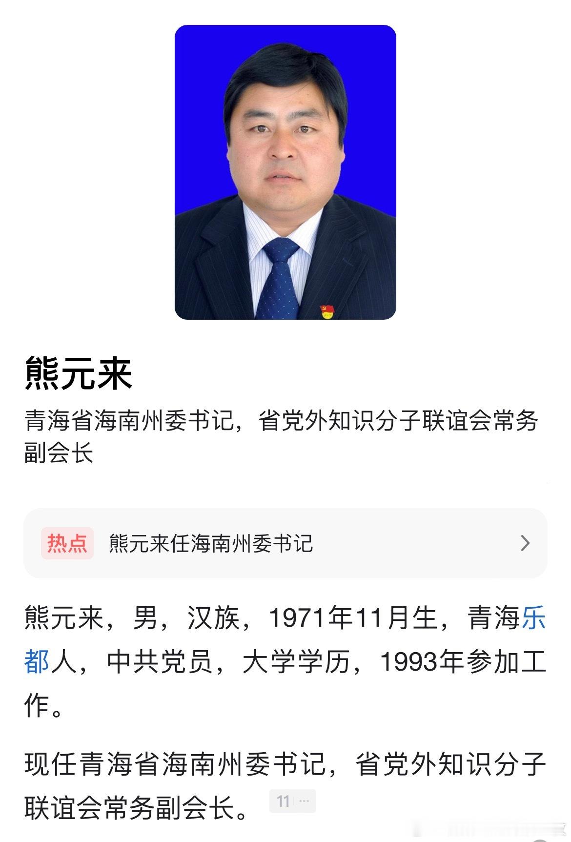 熊元来任海南州委书记。