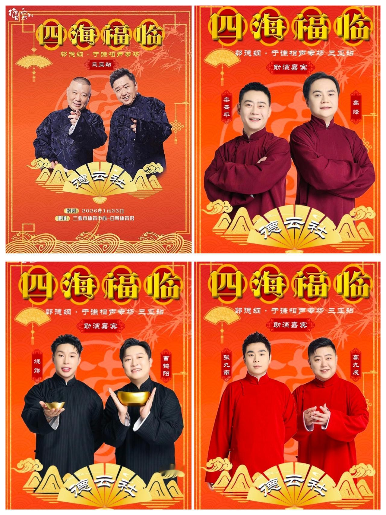 郭德纲今晚将在三亚举办相声专场,阵容是非常的豪华!高峰是郭德纲专场的常务倒二,只要高老板没有别的演出安排,基本上都是一起的。烧饼、曹鹤阳,张九南、高九成是另外两对助演。这次三亚的演出,大家对德云社接下来的相关安排也是很关注的。大封箱、开箱、相声春晚、成都、上海德云社成立,德云书馆开业等等,郭德纲在演出中,应该是会有透露的。