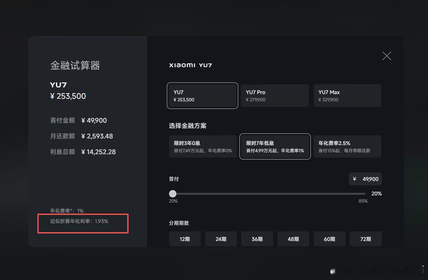 一个特斯拉带头,炸出来一堆7年免息但看了看各自的年化利率,还是特斯拉低(当然不包括Model3P)现在小米、理想、小鹏,包括吉利银河M9都有这政策了,但是银河的官网上并没有低息的金融的明细其他品牌的官网写的还是挺清楚的特斯拉Model 3是0.98%小米YU7是1.93%小鹏新P7是2.86%理想i6是4.69%理想MEGA是4.75%特斯拉特斯拉推出7年超低息购车雷军宣布小米汽车推出7年低息