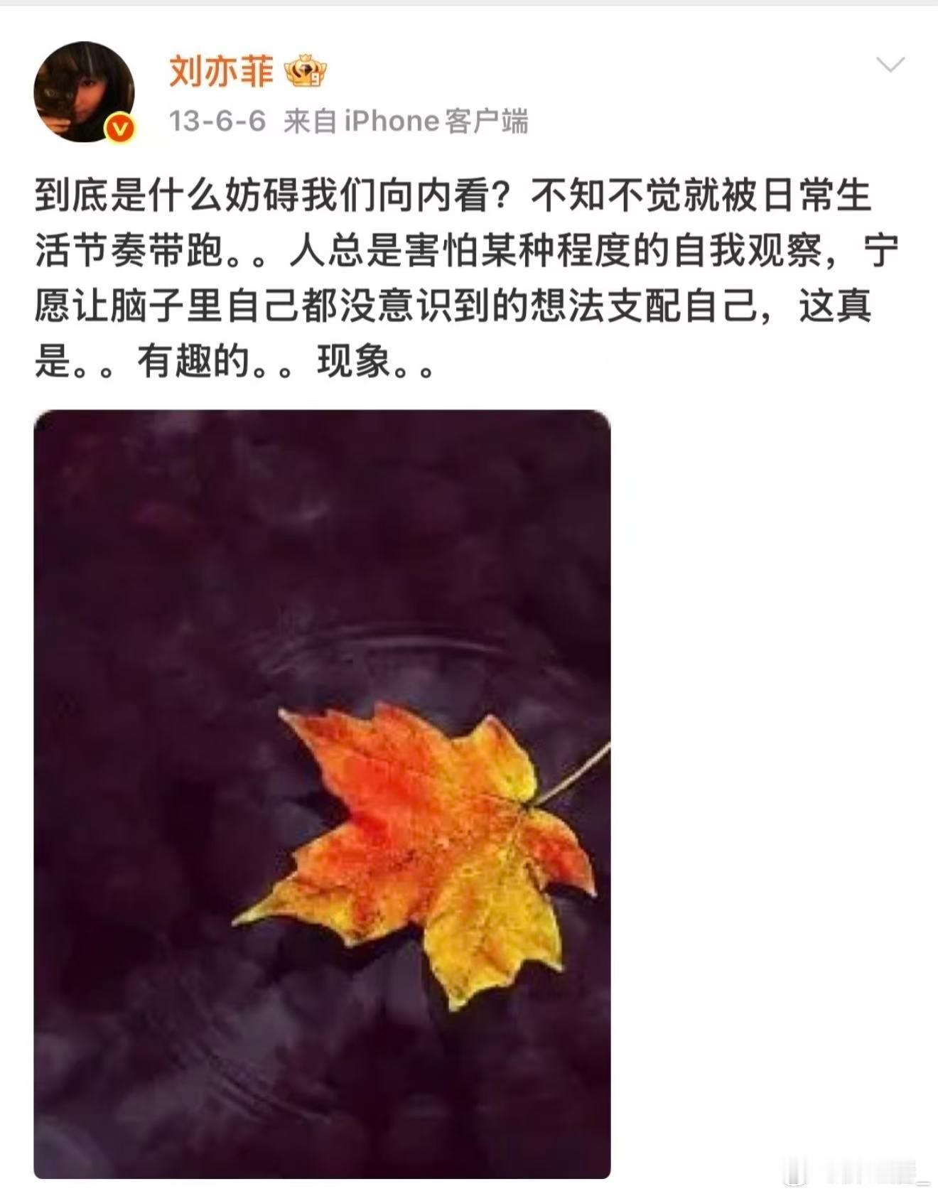 刘亦菲的松弛感绝了谁能不爱刘亦菲的松弛感!翻到她的早期微博,才发现早在二十多岁时,她就拥有了难得的清醒,专注于自我内心的感受,不向外追逐纷扰,这份由内而外的从容与通透,让她的松弛感浑然天成,真的太戳人了!