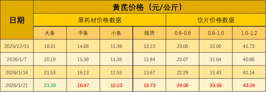 黄芪板块本周表现依旧稳健,中条与小条货源成为市场交易的主力。监测数据显示,黄芪中条均价升至16.47元/公斤,小条涨至12.13元/公斤,统货上行至13.73元/公斤。大条货源在前期冲高后,本周稳定在21.20元/公斤。目前正值冬季滋补消费的最旺季,产地货物流通速度明显加快,下游药店及商超备货积极,使得黄芪整体行情在稳健中持续向好。