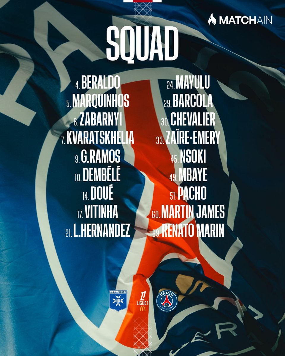 前锋:7-克瓦拉茨赫利亚、9-拉莫斯、10-登贝莱、14-杜埃、29-巴尔科拉、49-姆巴耶
