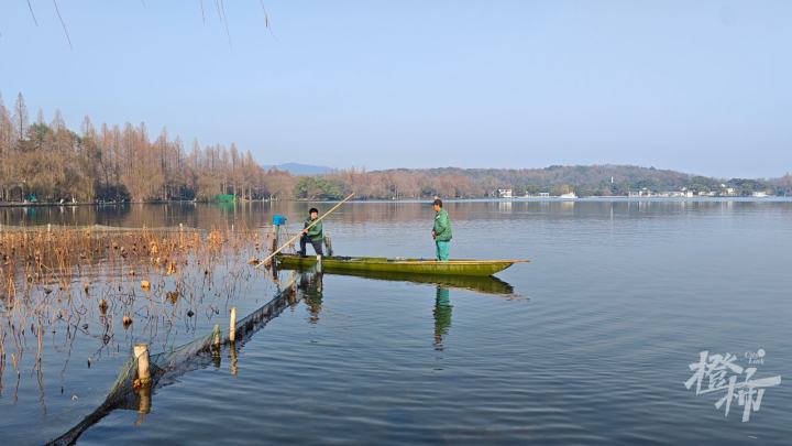 今天(1月23日)早上,西湖水面泛着寒意,几位荷花养护人员身着工作服进入小陈庄荷区,新一轮残荷收割工作正式开始了。