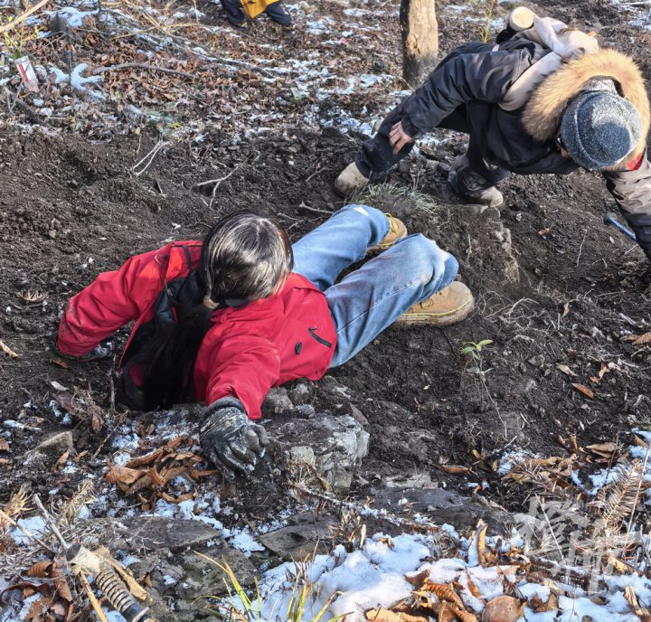 被困者十分狼狈,脸上带着崩溃的神情,裤子上沾着冰雪,被冻得紧贴在屁股上。