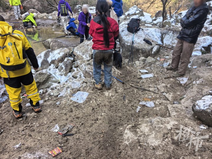狼行救援队执行大队长沈晓斌说,冰雪融化的天气,再好的冰爪都不太能派上用场,极容易发生滑坠事故,百丈岭侧面很陡峭,如果滑坠下去,后果不堪设想!一定要高度警惕。