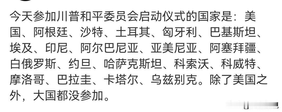 这次参加特朗普“和平委员会”的国家都有一个特点,首先都是小国,其次就是在地区和国际上话语权不多,甚至没有。在外交、经济和国家安全上也缺乏独立自主能力。其次就是对外政策没有延续性,喜欢左右逢源。并且普遍对美国有种莫名其妙的崇拜和畏惧。