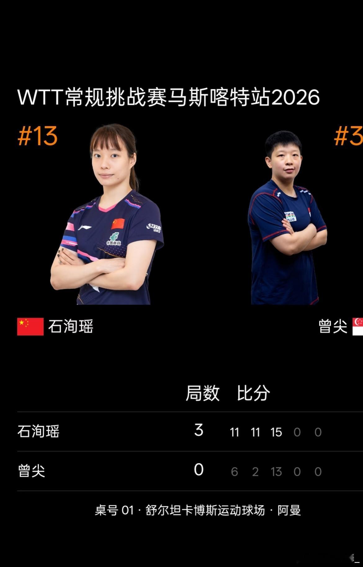 石洵瑶3比0曾尖不错不错……石洵瑶3-0零封曾尖,顺利晋级四强!真的是个好消息!这次的马斯喀特找第一位进入四强的中国队选手!石洵瑶加油!