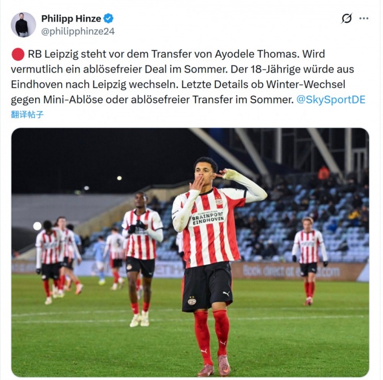 阿约德勒·托马斯与埃因霍温的合同今夏到期,莱比锡接近敲定这位小将,目前交易的最终细节仍在讨论之中——是冬窗低价提前加盟,还是等到今夏自由转会。