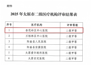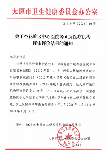 近日,太原市卫生健康委员会正式发布通知,确定杏花岭区中心医院通过二级甲等综合医院复审。