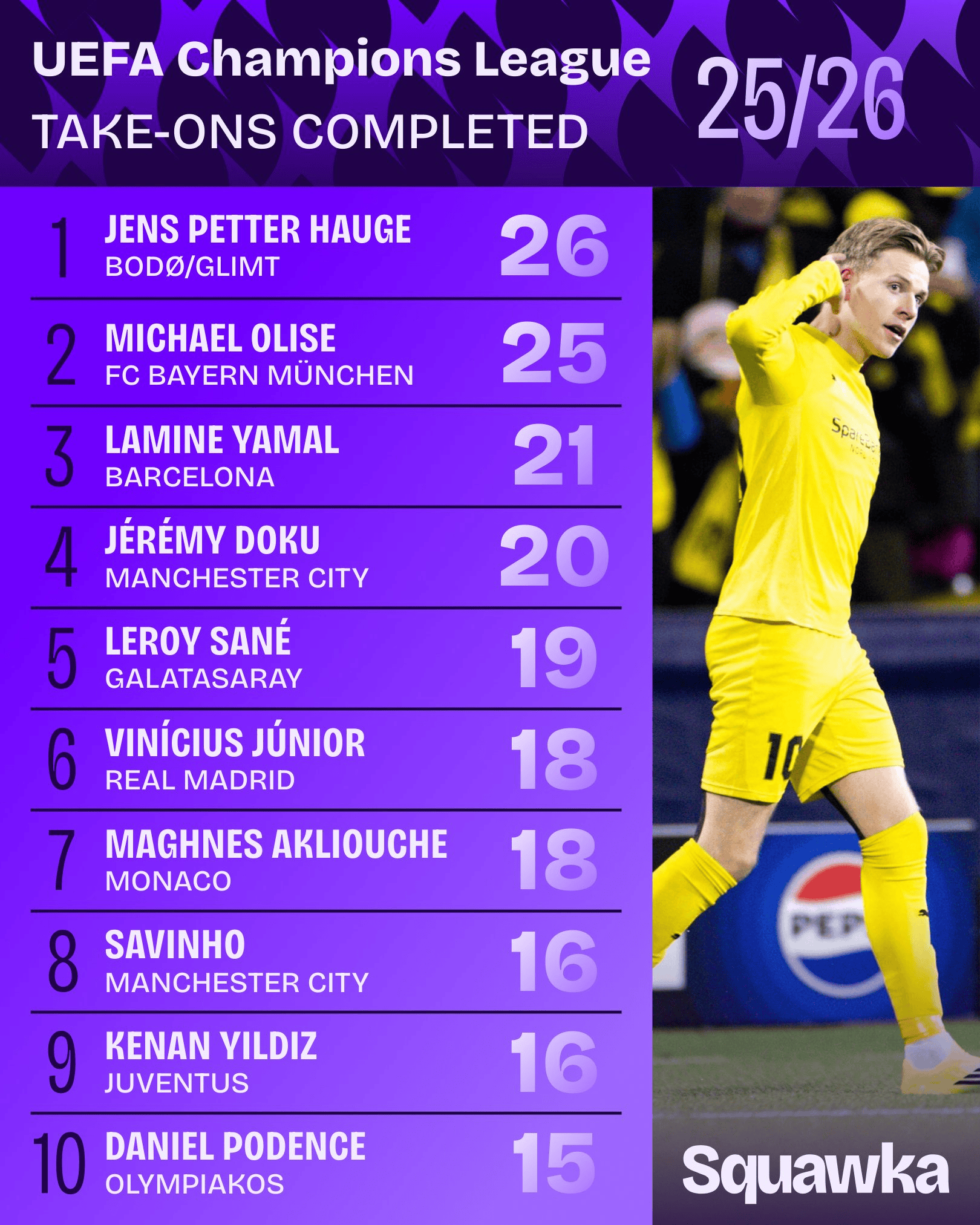 虎扑01月23日讯根据Squawka的统计,本赛季的欧冠联赛,目前只有海于格和奥利塞的成功过人次数达到了25次以上: