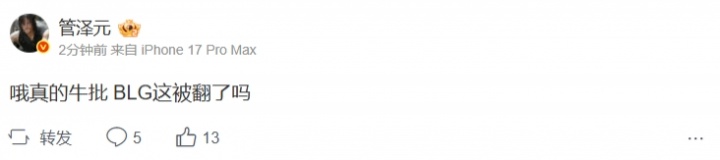 直播吧1月23日讯LPL第一赛段JDG首局击败BLG,赛后管泽元更博锐评:哦真的牛批BLG这被翻了吗。