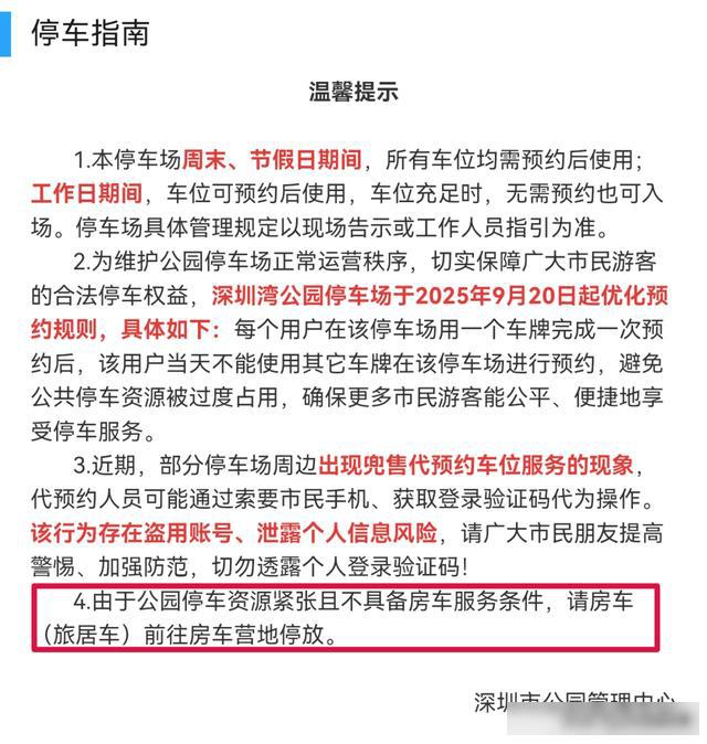 深圳市公园管理中心也发布提示:由于公园停车资源紧张且不具备房车服务条件,请房车(旅居车)前往房车营地停放。