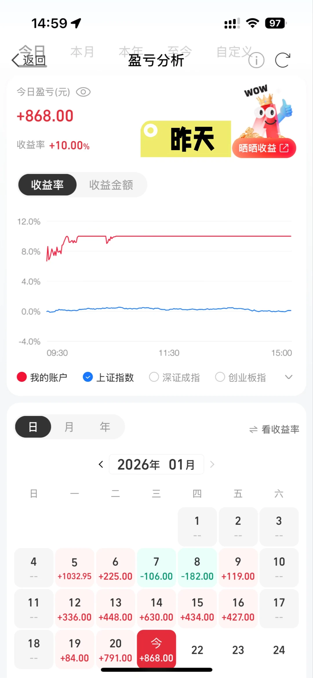 纪念一下这个收益终于大于本金的日子,之前家人都劝赶紧卖赶紧卖但一直拿住没动,经历连续两个涨停日后今天忍痛卖了,万一卖飞也只能认了[失望R]