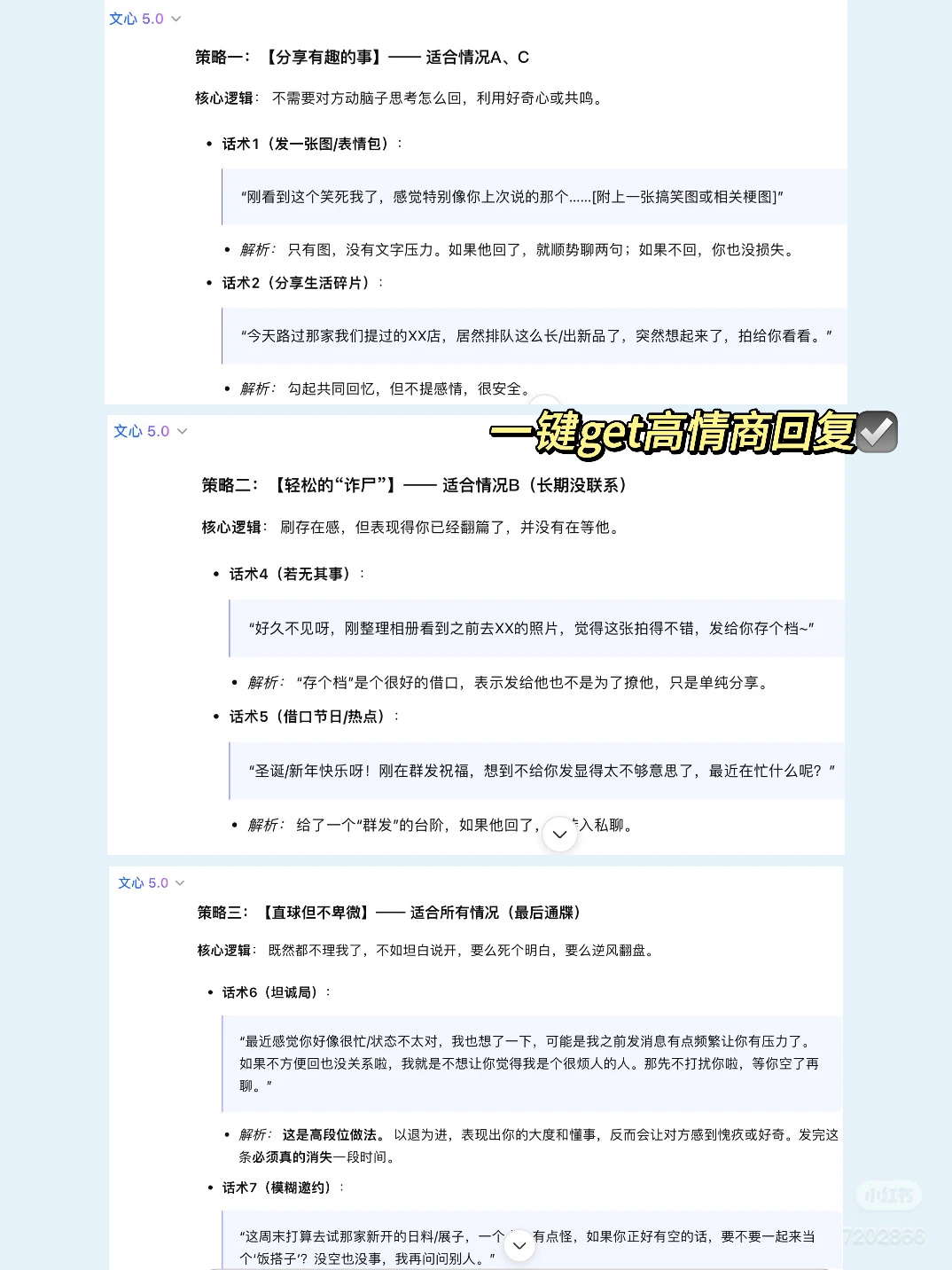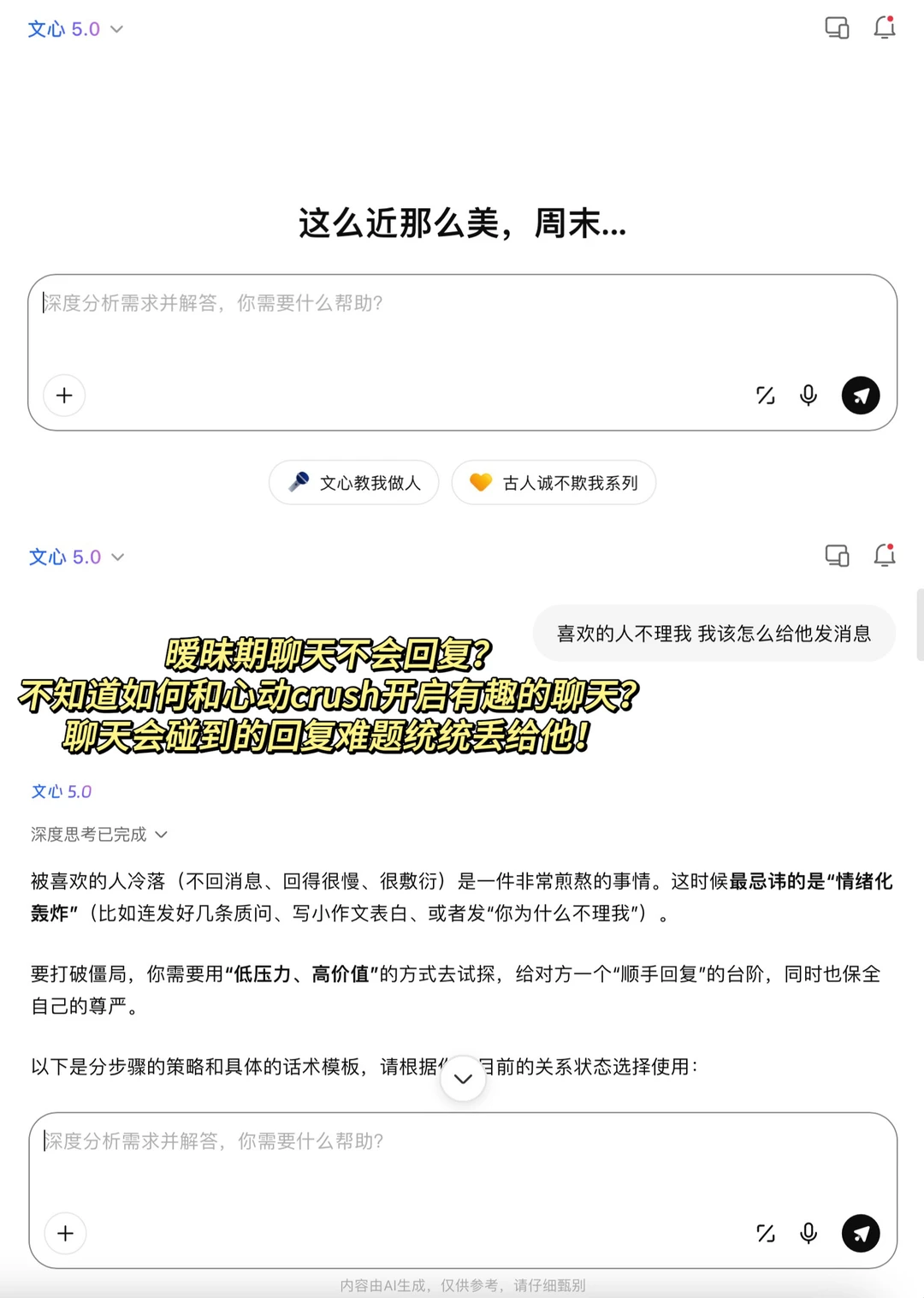 恋爱氛围感十足 一些有趣的回复也可以让人很开心 以前我也不太懂得这些 但是ai用多了看多了搜多了自然而然也就会了 文心5.0上面全是我的战绩哈哈哈 真的是有点懂男女的小心思 轻松帮你找到恰到好处的回复话术 让聊天变得简单又有趣 妥妥的恋爱好搭子 不会聊天的姐妹真心安利大家用用ai 可能会有意想不到的收获~ 说到底还是得靠文心5.0这个最强文科生,不管是暧昧氛围感话术、高情商接梗还是精准拿捏心动小心思,它都能秒出高招,把恋爱聊天的分寸感 和趣味性拉满,妥妥的脱单聊天神器! 你们暧昧期有过哪些封神的聊天回复? 评论区甩出来让大家抄抄作业~