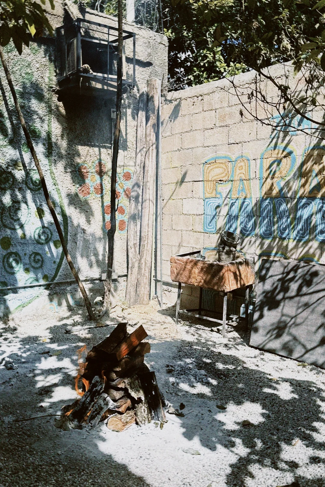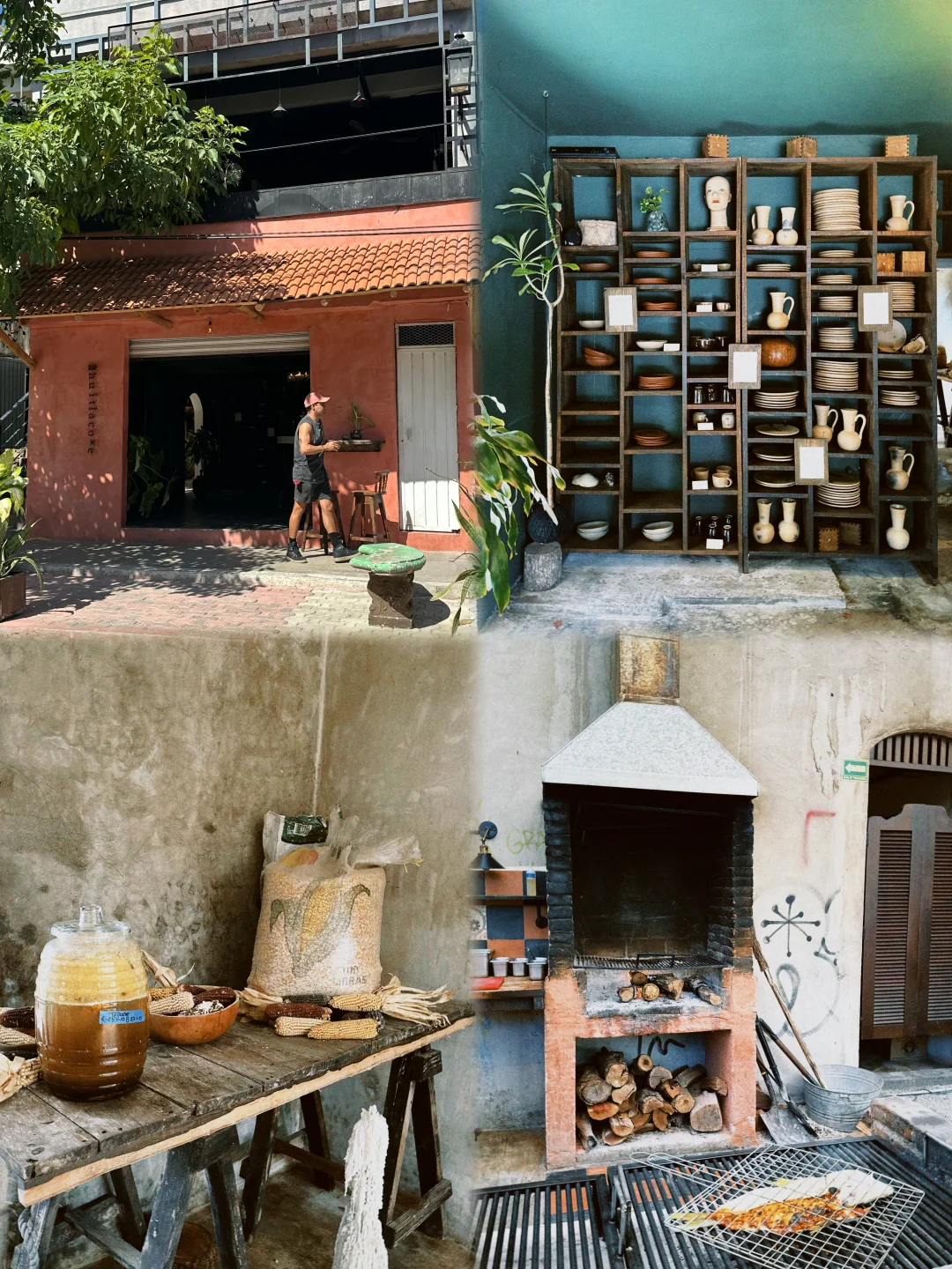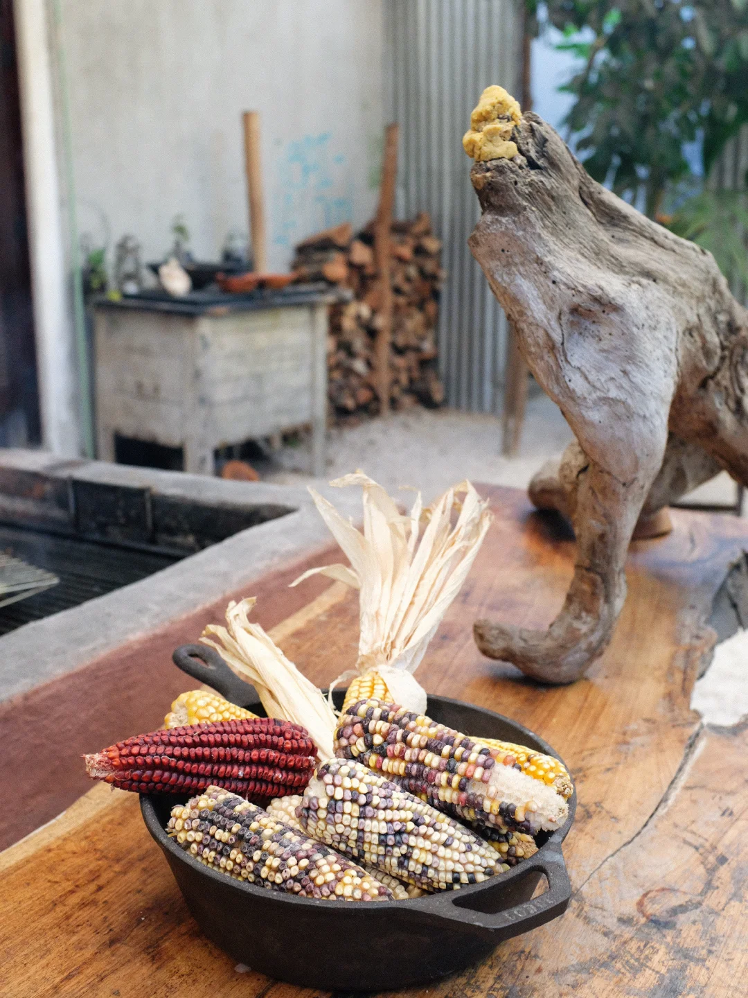 不起眼的砖红色店门,院子里别有洞天。餐桌旁边就是开放式烧烤台,烤鱼烤肉、手工现做玉米饼,全都在客人的眼皮底下进行,角落里还生着一堆篝火。