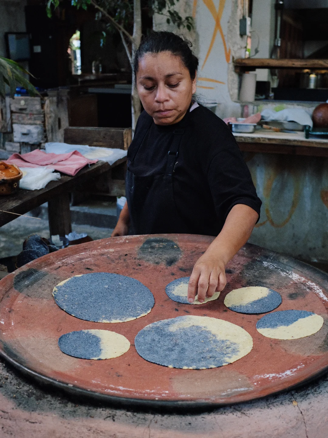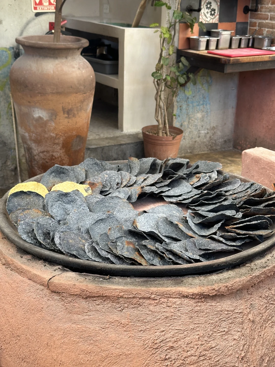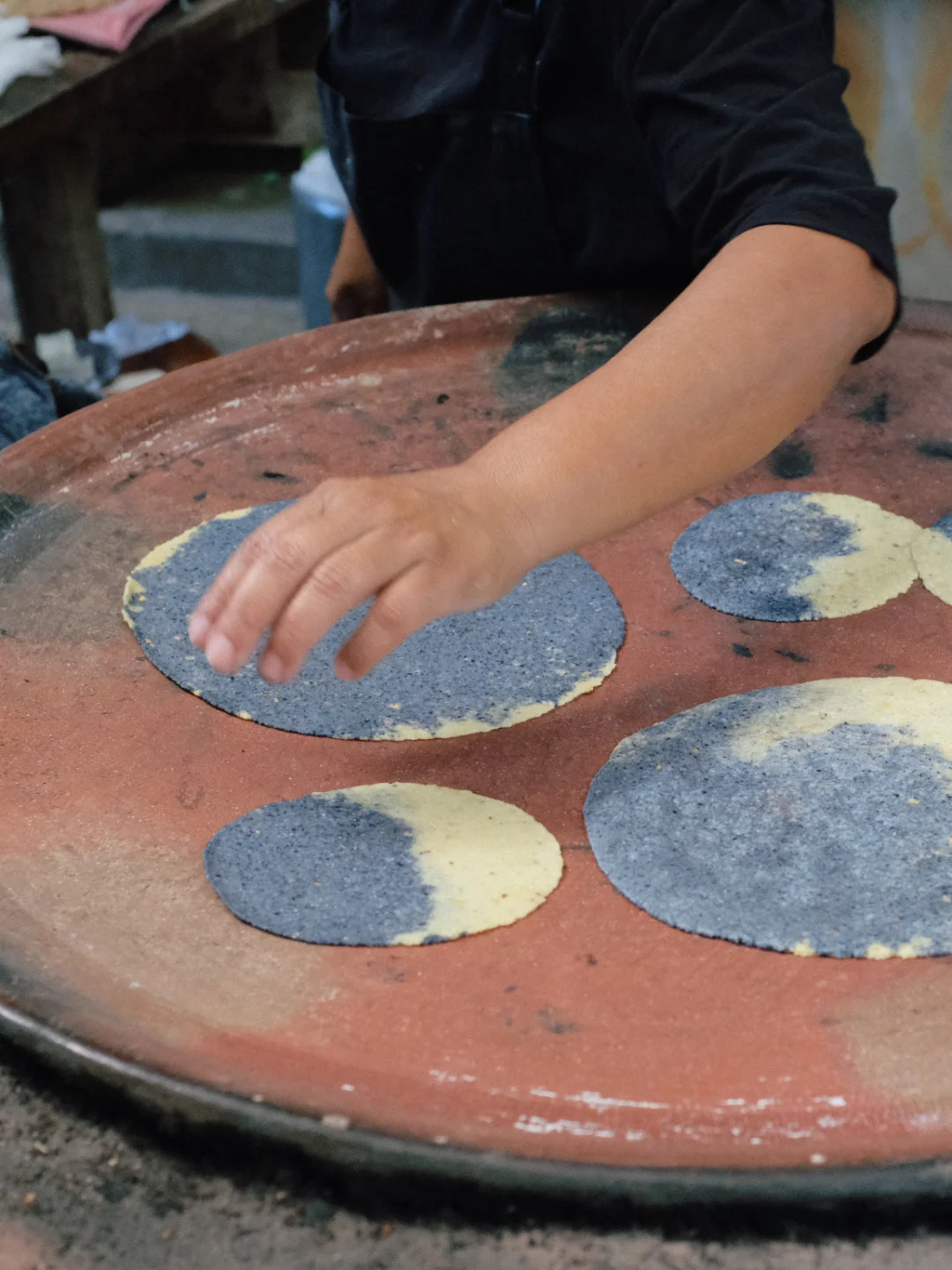 玉米饼是蓝黄双拼色的,蓝玉米+普通玉米,由熟练工阿姨一张张揉出来、再放到铁板烧烘烤制成。每一张的纹理都不尽相同,远远望去,好像看到无数个月球表面,有着深沉的阴暗面和粗粝的光亮面。