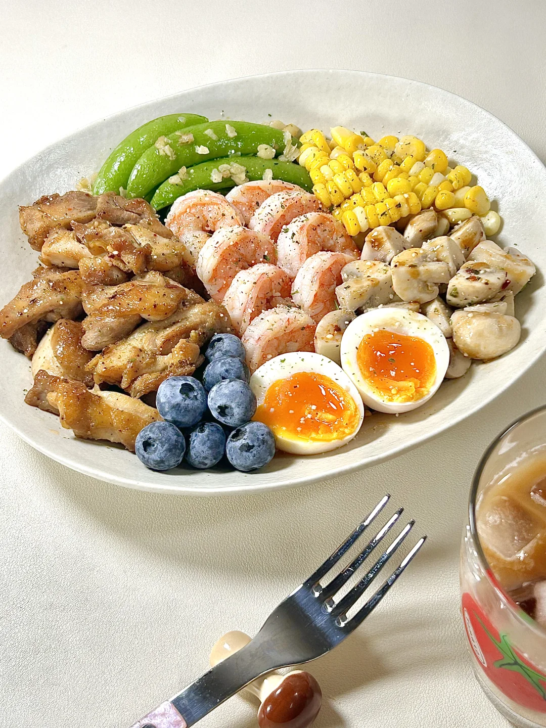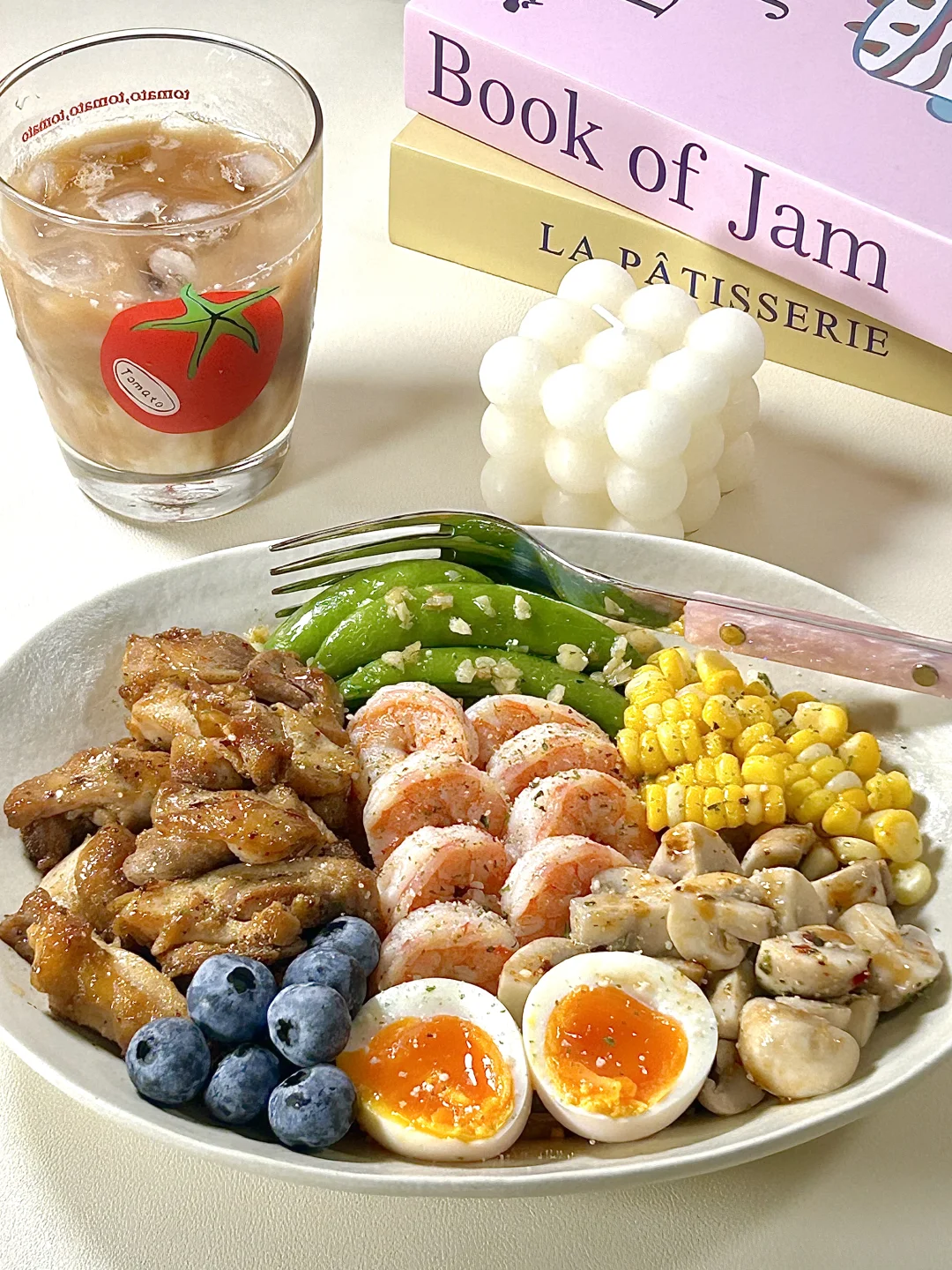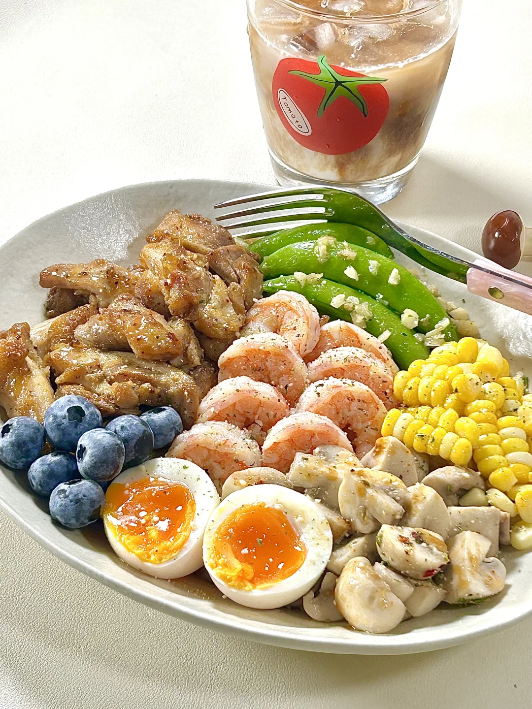 自律餐也要丰富好吃啊🍗 优质碳水膳食纤维 高蛋白搭配 低卡又饱腹! 食材:🍤 虾仁+鸡腿+溏心蛋+荷兰肉+口蘑+蓝莓+玉米 今天的牛奶美式也超乎意料的好喝!搭配沙拉碗绝了!