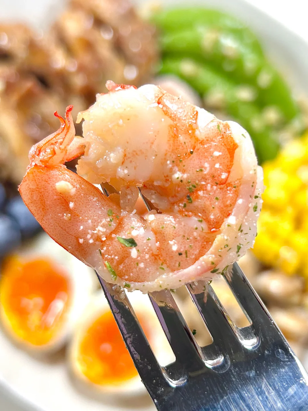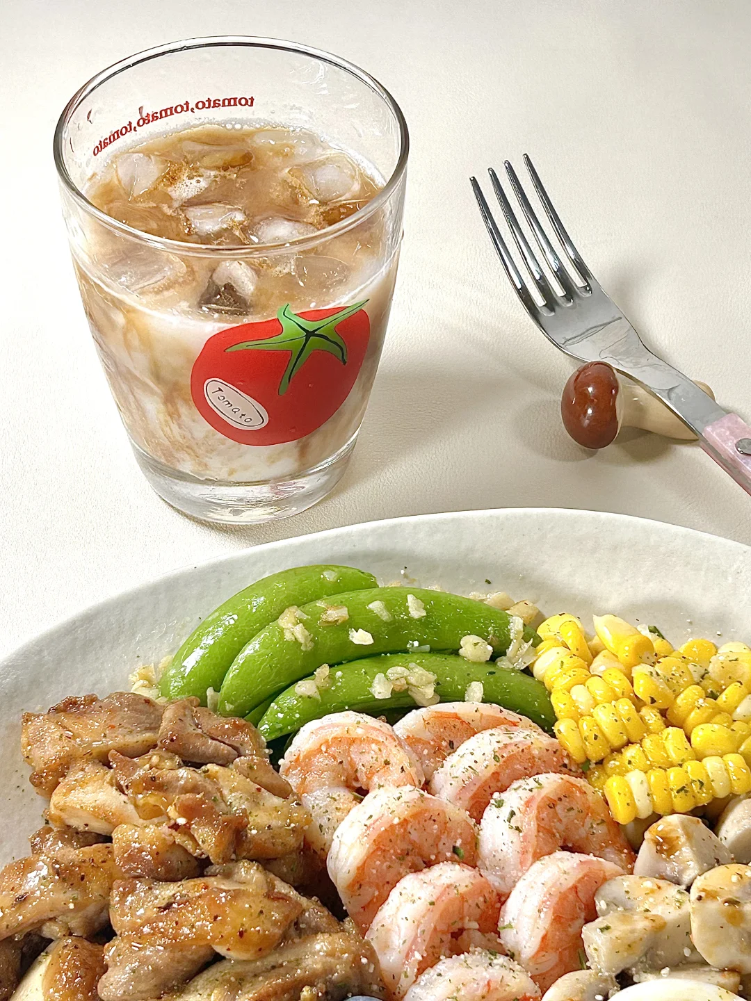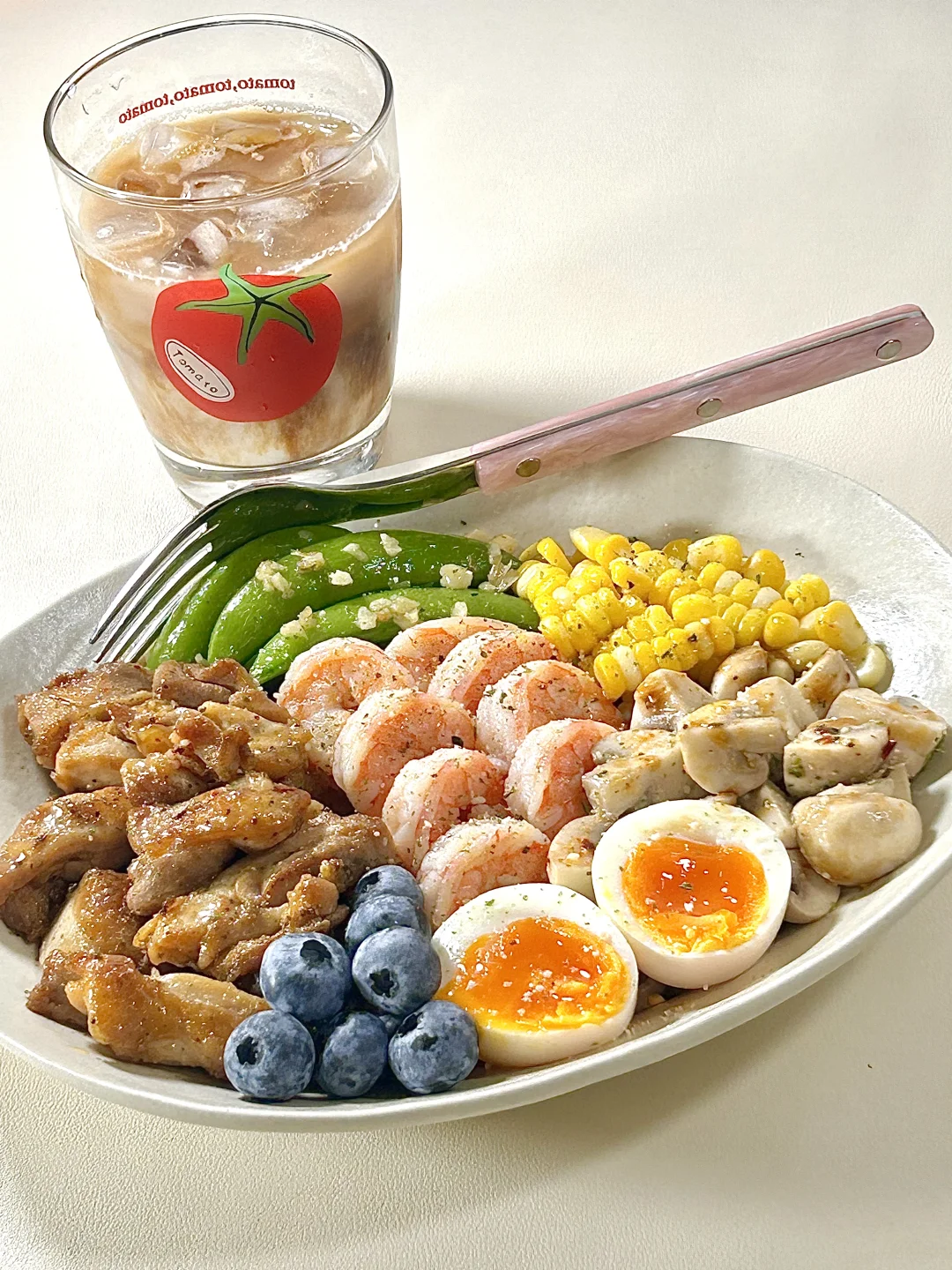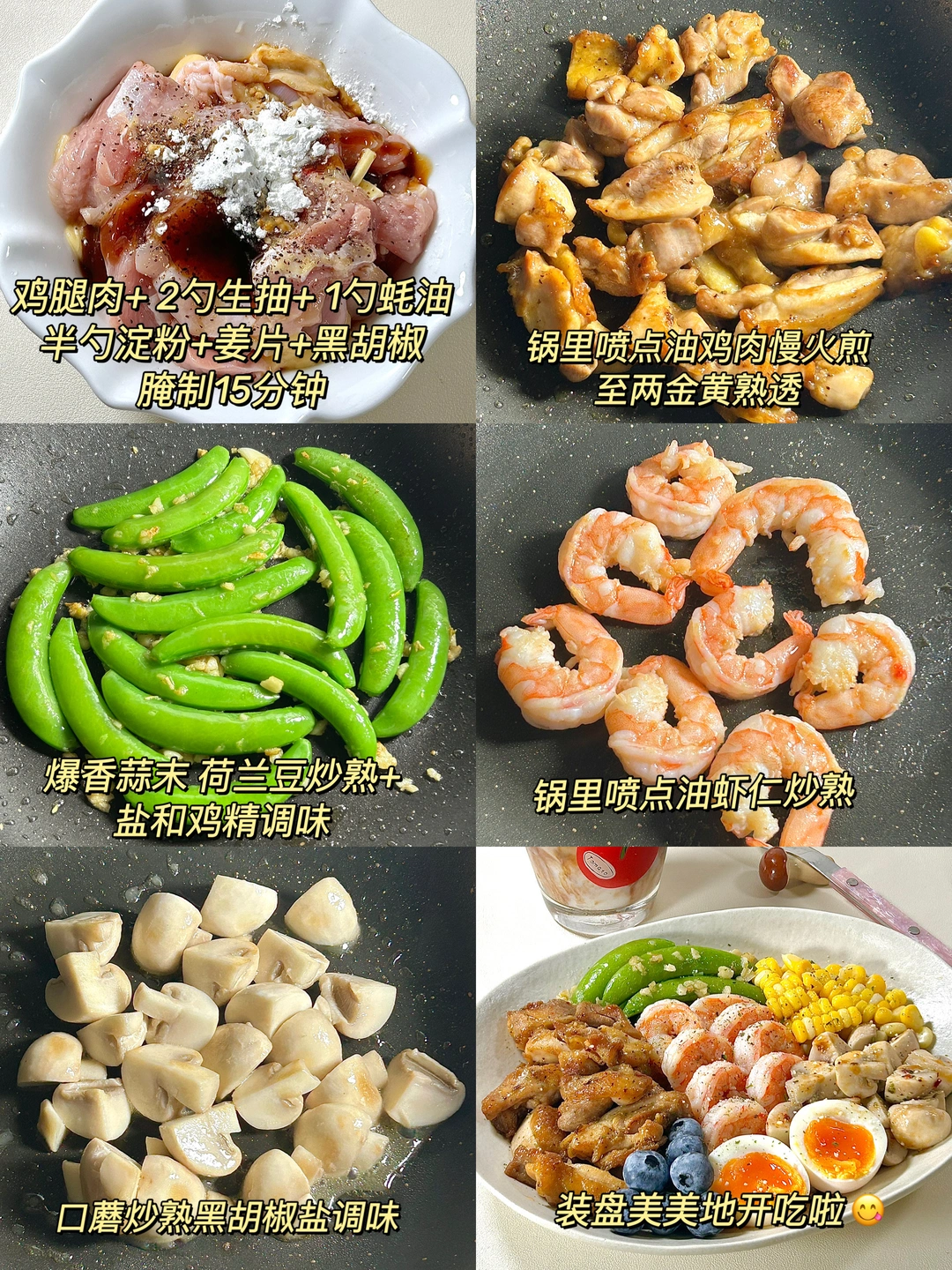 自律餐也要丰富好吃啊🍗 优质碳水膳食纤维 高蛋白搭配 低卡又饱腹! 食材:🍤 虾仁+鸡腿+溏心蛋+荷兰肉+口蘑+蓝莓+玉米 今天的牛奶美式也超乎意料的好喝!搭配沙拉碗绝了!