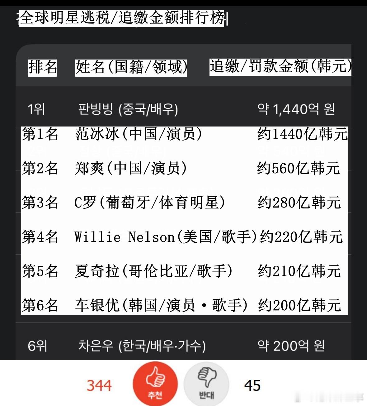 🔥韩网热帖评论翻译🔥车银优泡沫终于破裂了 荣登全球明星逃税排行榜6位韩网原帖