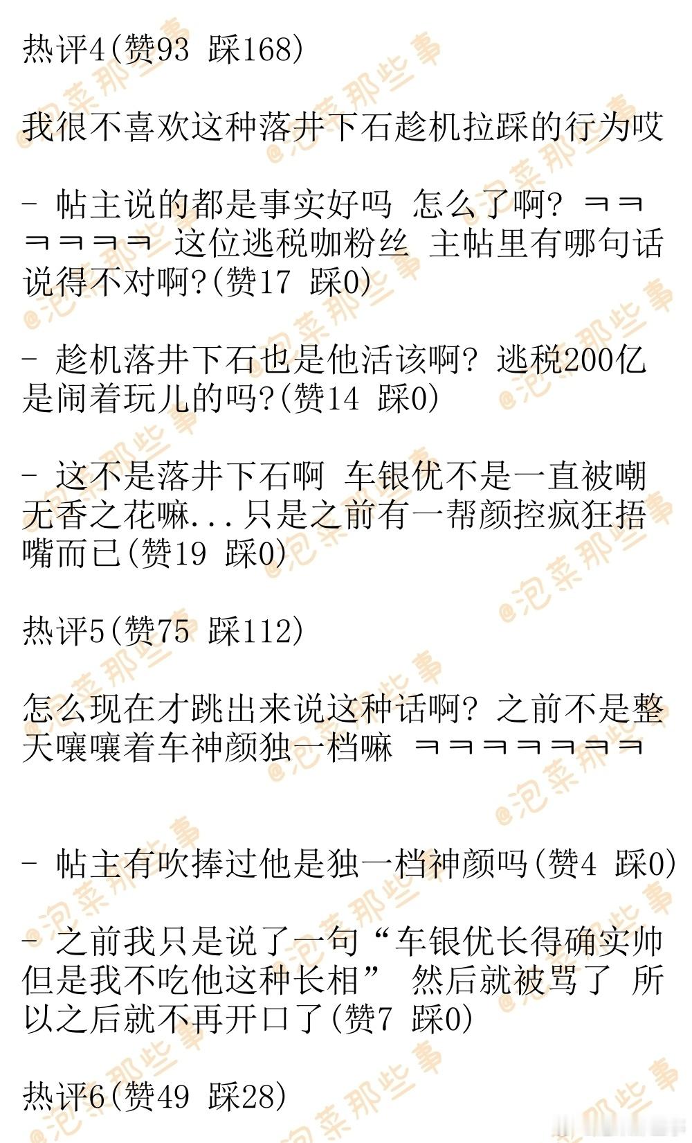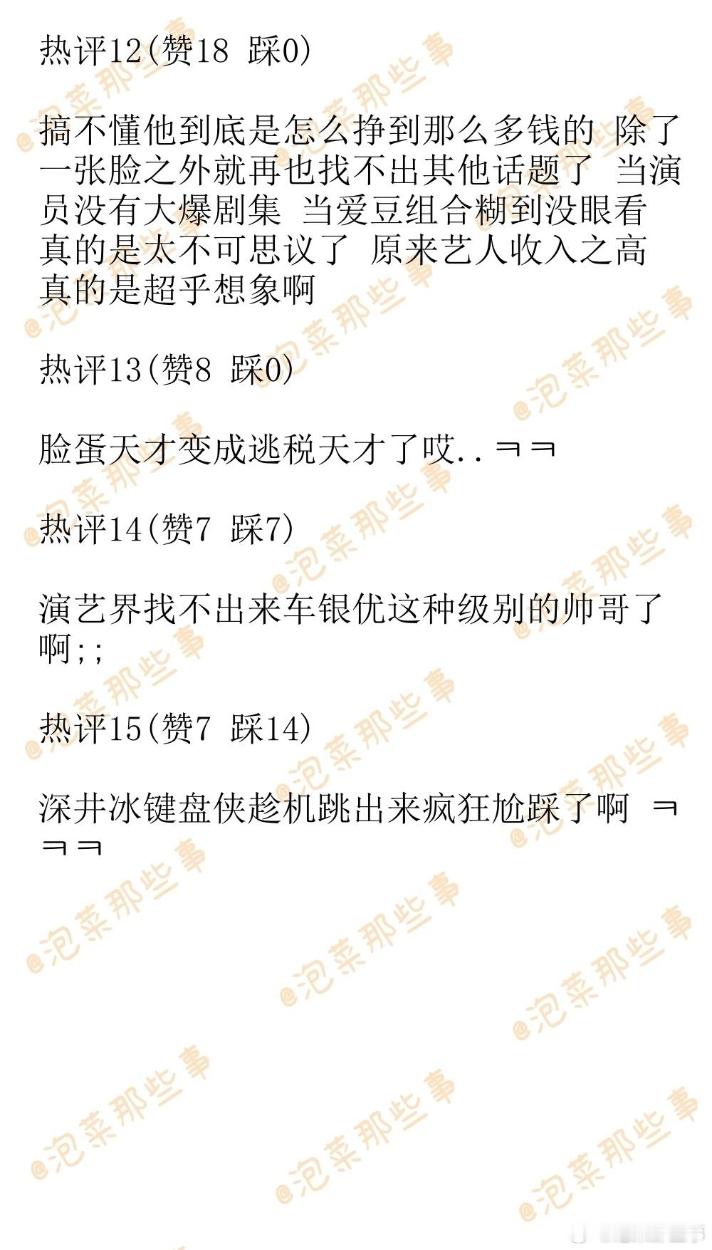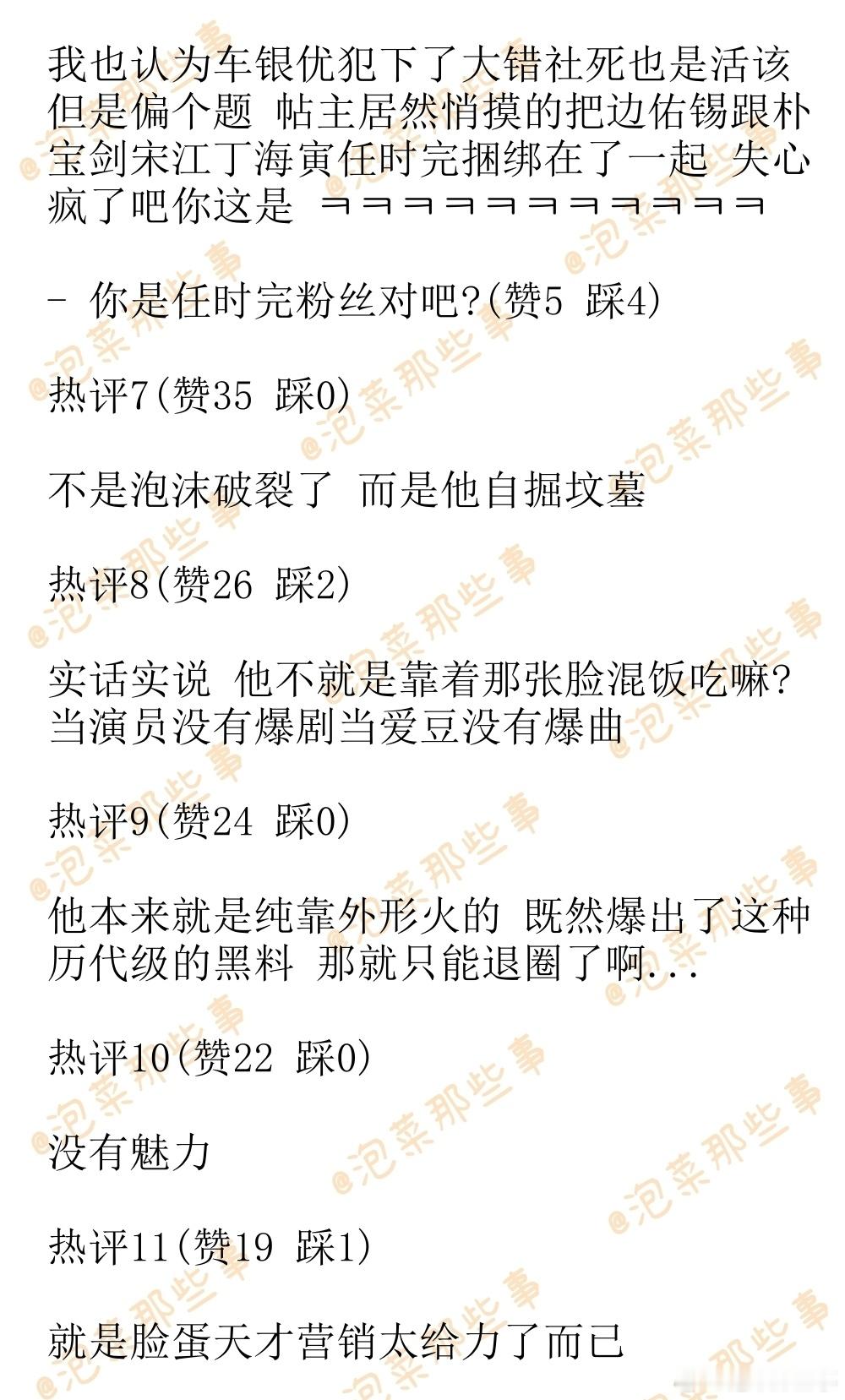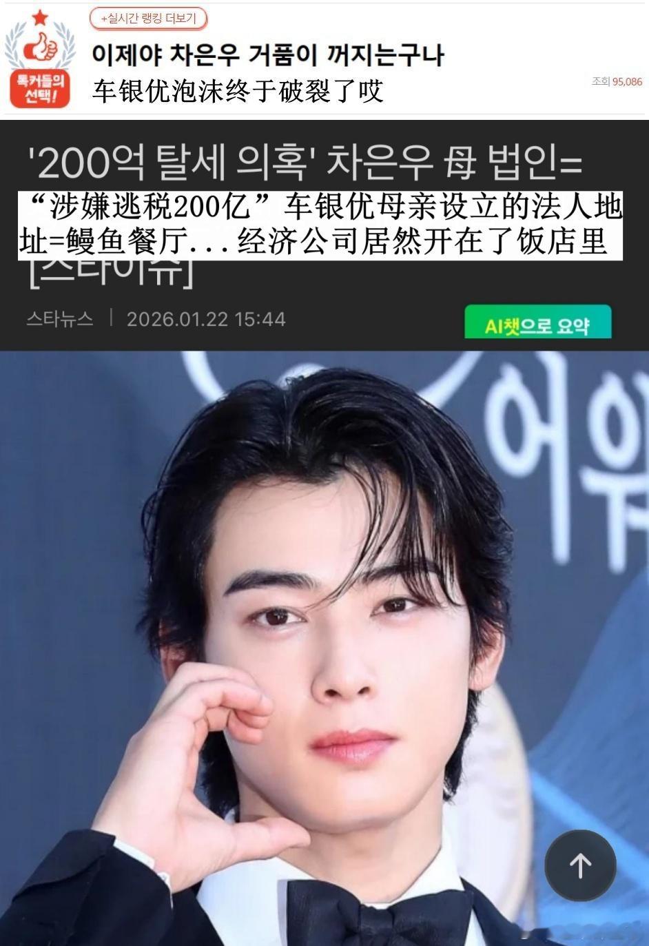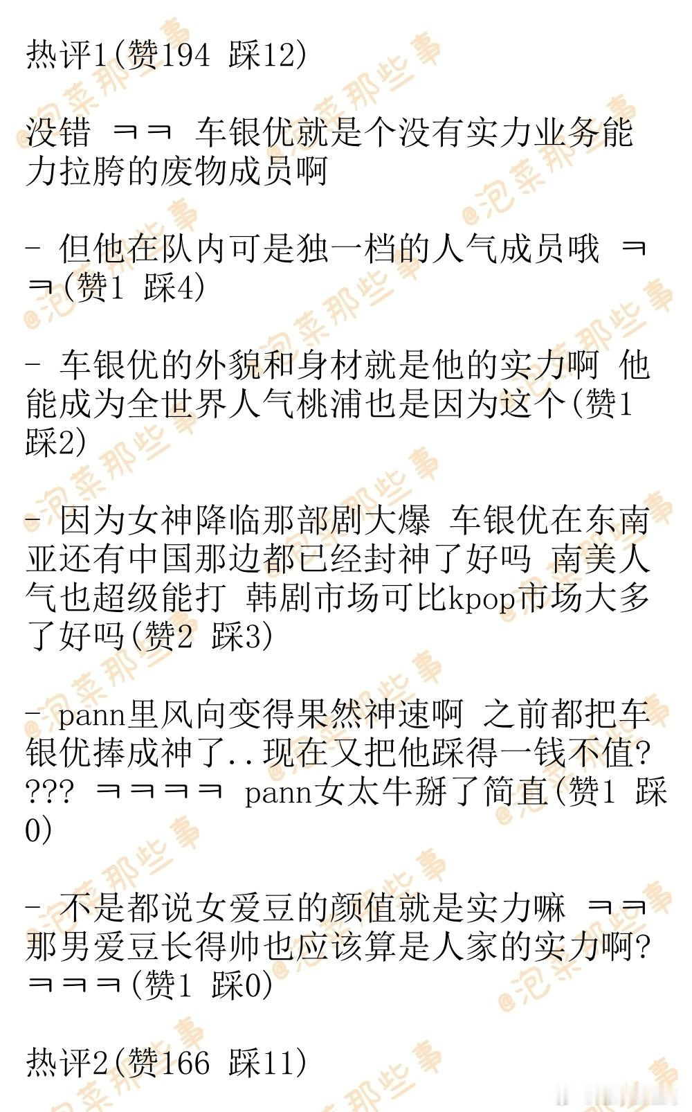 🔥韩网热帖评论翻译🔥车银优泡沫终于破裂了 荣登全球明星逃税排行榜6位韩网原帖帖主称:车银优泡沫终于破裂了哎 长得好看? 演艺界帅哥多了去了好吗 颜值这玩意儿又没有客观答案 新生代男演员之中 朴宝剑 宋江 丁海寅 任时完 边佑锡 完全可以取代车银优 演戏演得好吗? 拉胯跳舞跳得好吗? 拉胯唱歌唱得好吗? 拉胯综艺做得好吗? 拉胯因为能拿得出手的就只有那张脸 所以经纪公司大力营销神颜 让他成了帅哥的代名词 但其实演艺界从来都不缺车银优这种级别的颜值..他还营销过学霸人设 可是读艺高成绩好并不那么值得炫耀啊 跟普高没得比..虽然是成均馆大学出身 但专业是表演艺术 ㅋㅋ成均馆大学表演艺术系入学的时候不看成绩 看的是身高外形演技这些虽然有成大毕业的名头 但跟那些靠优异成绩入读成大的学生们不能相提并论…“最爱是最爱 车银优是车银优” 这个梗也是经纪公司营销出来的…他还有很多整容争议..do卧蚕 开眼角 等等等等...逃税这档子事儿就不用我多说了 据说他入伍服役那会儿还买了不少正面通稿 如果是真的 那实在是太恶心人了...车银优涉嫌逃税cr.pann