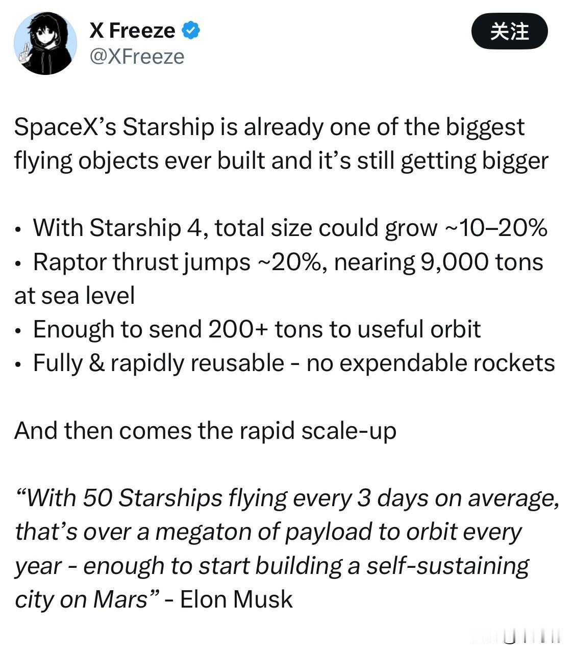 SpaceX的星舰已经是迄今为止建造过的最大飞行器之一,而且还在不断增大。 • 随着星舰4号的建造,总尺寸可能会增加约10-20%。 •猛禽式推力跳跃约20%,在海平面接近9000吨 • 足以将200多吨物质送入有效轨道 • 完全可快速重复使用——无需一次性火箭 然后就是快速扩大规模。 “平均每三天就有50艘星舰发射升空,这意味着每年有超过100万吨的有效载荷进入轨道——足以在火星上建造一座自给自足的城市。”——埃隆·马斯克