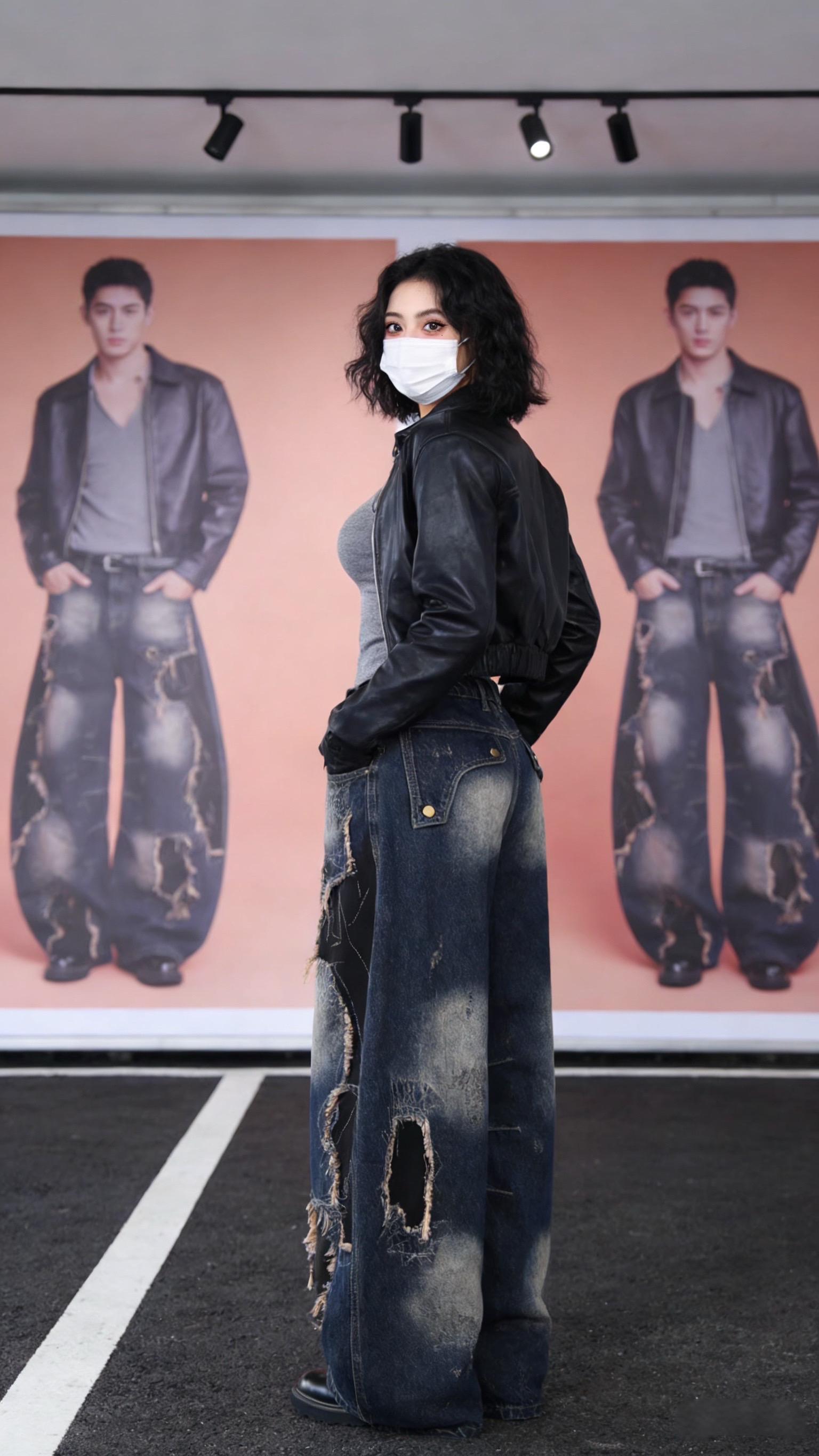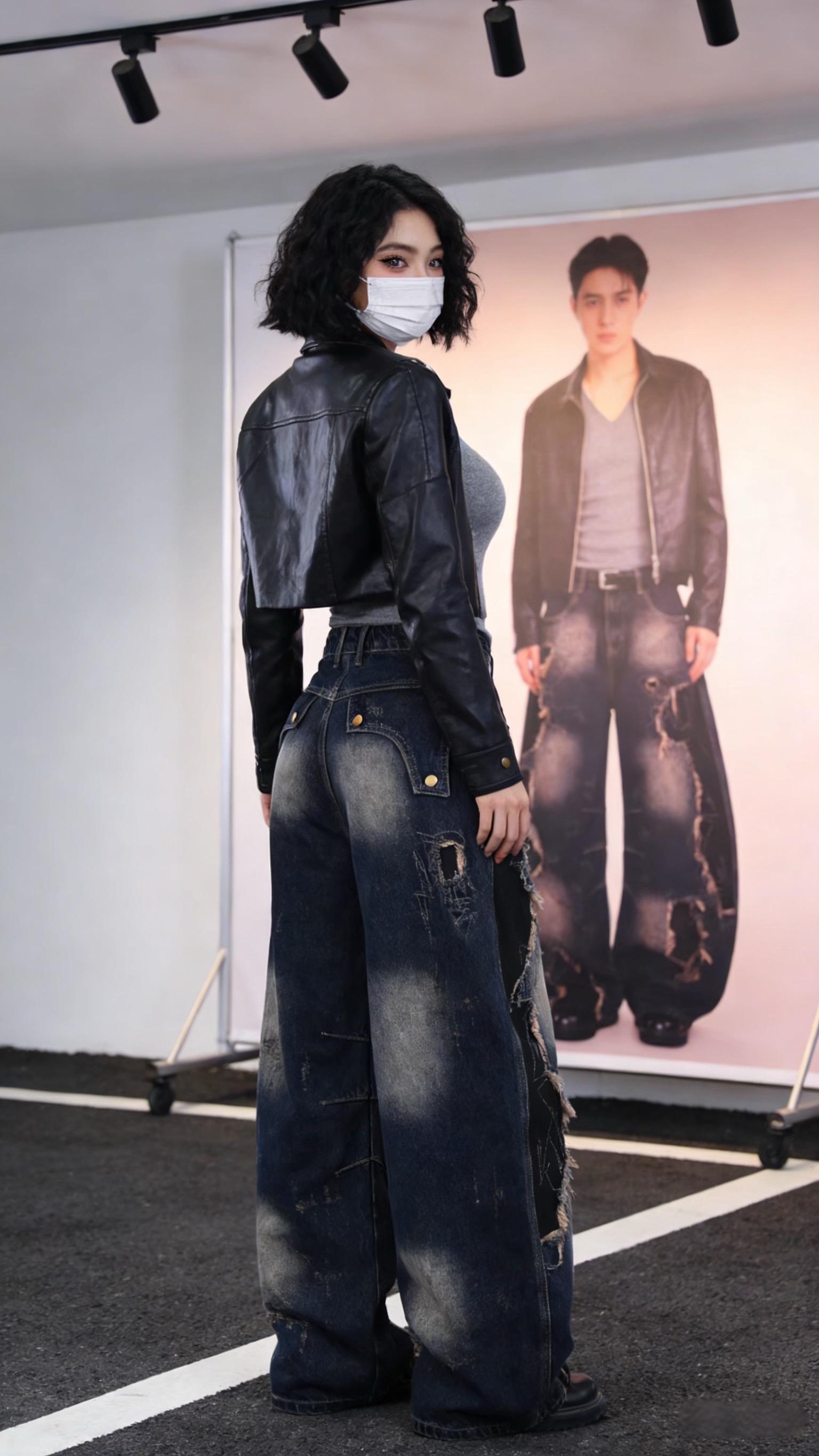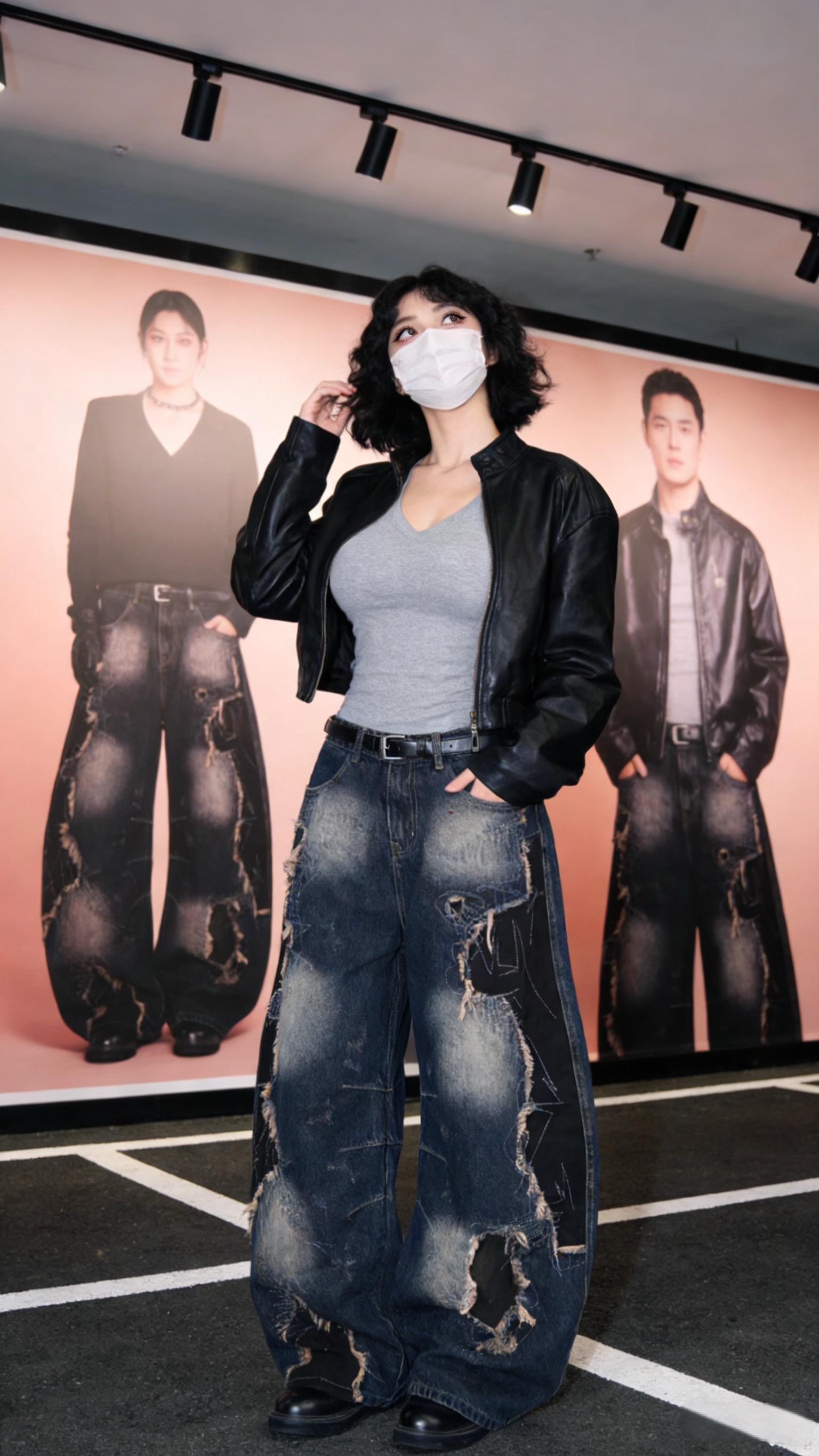 设计感重工解构做旧废土风牛仔裤男款潮复古破洞拖地阔腿弯刀裤