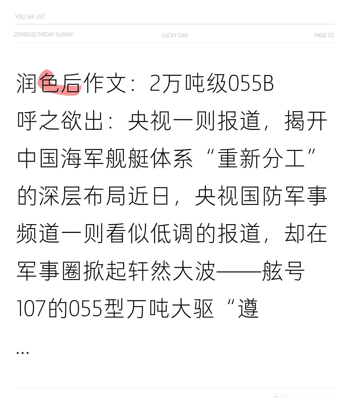2万吨级055B呼之欲出:央视一则报道,揭开中国海军舰艇体系“重新分工”的深层布局 近日,央视国防军事频道一则看似低调的报道,却在军事圈掀起轩然大波——舷号107的055型万吨大驱“遵义舰”,与潜艇部队展开了一场“背靠背”自由对抗反潜演练。表面看,这不过是一次常规训练,但若置于当前人民海军舰艇体系加速演进的背景下,这场“055练反潜”的演练,实则暗藏玄机,或为未来海军主战舰艇结构的“重新分工”埋下关键伏笔。 055“降维反潜”:是“大材小用”还是战术预置? 不少人初闻此讯,第一反应是质疑:让055这种中国海军“顶级水面作战平台”去执行反潜任务,是否有些“大材小用”?毕竟,在传统海战分工中,反潜作战通常由护卫舰、通用驱逐舰或专职反潜舰艇承担,而055作为万吨级“神盾舰”,其核心使命更偏向防空指挥、区域防空、远程对海打击及编队核心节点控制——简言之,它本应是航母编队的“中枢大脑”与“防空中枢”,而非“追潜干苦活”的角色。 然而,军事体系的分工逻辑,从来不是以装备“贵不贵”为标准,而是以“战时最坏情况”为倒推依据。055强化反潜训练,表面看是“降维使用”,实则可能是在为一种新的战术定位做准备:即在航母编队中承担更前出、更高风险、更偏战术节点的任务,而非单纯的“贴身保镖”。 从“提康德罗加”到055:前出节点的生存逻辑 回顾美国海军经验,航母编队中真正的“中枢舰”,往往是类似“提康德罗加”级巡洋舰的防空作战指挥舰,负责区域防空、态势融合与指挥协调。而前出至编队外围的“雷达哨舰”,则因直接暴露于潜艇、反舰导弹与空中打击威胁之下,必须具备独立反潜、独立生存与独立作战的综合能力——既要“看得远”,也要“打得狠”,更要“活得久”。 将这一逻辑套用到055身上,一个耐人寻味的可能性浮现:未来在航母编队中,055未必是“最高级护卫”,反而可能是“高端前出节点舰”。它的地位依然关键,但已非“天花板”——那么,真正的“编队中枢舰”会是谁?答案或许指向传闻已久的2万吨级055B型驱逐舰,甚至是中国海军事实上的“国产巡洋舰”。 从“驱逐舰”到“巡洋舰”:吨位与功能的双重跃迁 过去,人民海军始终将055划为“驱逐舰”,在分类上刻意避免使用“巡洋舰”这一概念。但随着吨位持续膨胀(首批055满载排水量1.3万吨)、舰载系统复杂度急剧提升、编队作战中枢需求不断上升,“巡洋舰”这一舰种正以事实形态回归——即便名义上不恢复,功能上也已实质存在。 近年来,多条线索正在汇聚: • 吨位突破:卫星影像显示,新型驱逐舰水泥分段平台舰宽达26米,满载排水量或逼近2万吨; • 动力冗余:国产CGT-30、CGT-40燃气轮机成熟,为更大吨位舰艇提供可靠动力支撑; • 全球趋势:日本下一代ASEV神盾舰已接近1.7万吨,中国若维持技术代差,迈向2万吨级几乎是必然选择。 在此趋势下,055B型的定位极可能是“编队指挥核心 + 战区级防空中枢 + 多域信息融合节点”,承担起过去055尚未完全展开的战略级任务。而原有的055A型,则逐步转向战术节点舰、雷达前哨舰、高端综合护航舰——这正解释了为何如今要强化其单舰反潜、自主作战与生存韧性等能力。 055“反潜苦练”:不是降级,而是“让位” 从这个角度看,055练反潜并非“浪费”,而更像是一次角色下沉与功能重塑:不是055变弱了,而是中国海军的“天花板”被整体抬高了。与此同时,美国高调炒作“特朗普级战列舰”(3—4万吨级“超级水面舰”)的消息,更像是一种战略焦虑的外溢——其构想更多停留在政治象征层面,而中国的路径则明显更务实:不追求象征性“巨舰”,而是稳步推进“功能级跃迁”。 与其打造一艘“新时代战列舰”,不如打造一型真正适配航母编队、远洋决战与信息化作战的2万吨级超级驱逐舰/巡洋舰。在现实作战需求与工业能力之间,中国显然选择了更理性的路线。因此,055的“反潜苦练”,或许并非降级,而是一次提前的“让位”——为更高端的平台腾出战略空间,也为未来的舰队结构重构提前打底。 结语:从“万吨时代”到“准巡洋舰时代” 如果说055代表了中国海军迈入“万吨时代”,那么即将到来的055B,很可能象征着中国水面舰艇正式迈入“准巡洋舰时代”。而当这一代舰艇成型,今天看似“奇怪”的训练动作,回头看,或许正是一次极其清醒的提前布局——中国海军,正在以自己的节奏,重塑全球海洋的权力格局。055大驱 055战力展示 055大驱舰队 055b驱逐舰 海055大驱 055万吨大舰 055防空能力
